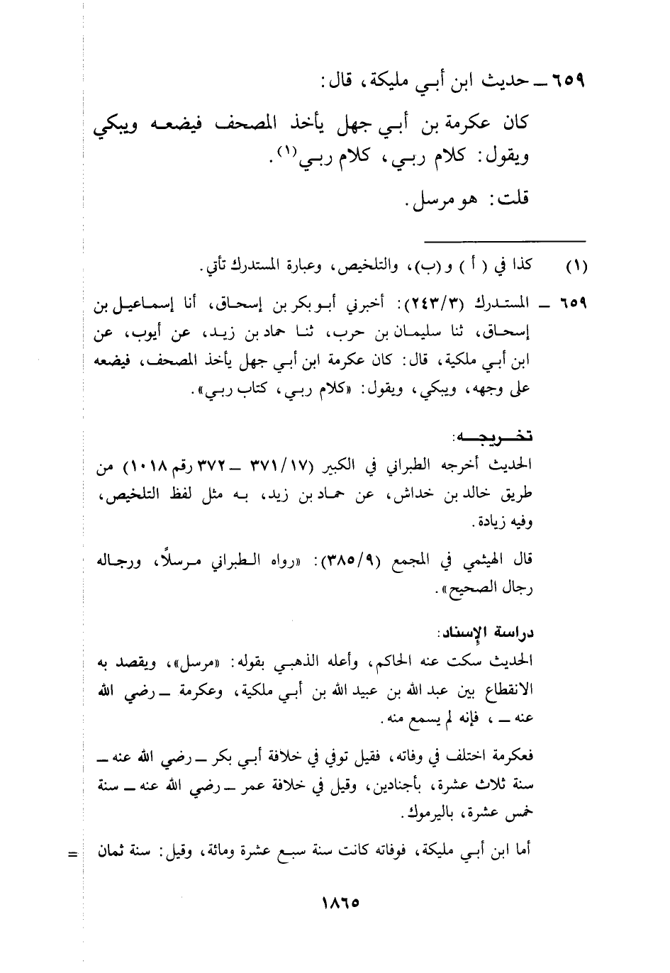 659 - المستدرك (3/ 243): أخبرني أبو بكر بن إسحاق، أنا إسماعيل بن إسحاق، ثنا سليمان بن حرب، ثنا حماد بن زيد، عن أيوب، عن ابن أبي ملكية، قال: كان عكرمة ابن أبي جهل يأخذ المصحف، فيضعه على وجهه، ويبكي، ويقول: "كلام ربي، كتاب ربي".