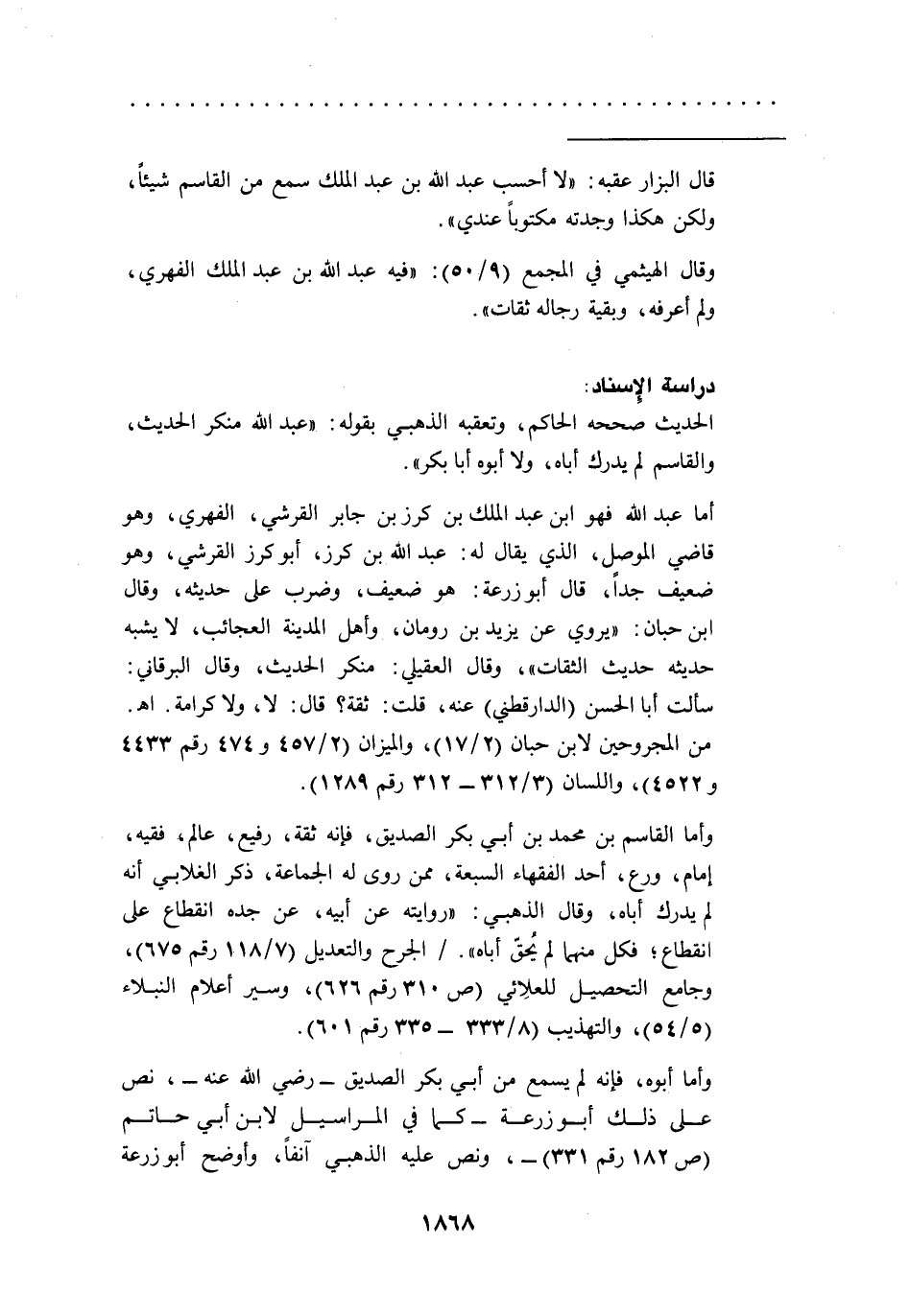 = قال البزار عقبه: "لا أحسب عبد الله بن عبد الملك سمع من القاسم شيئاً، ولكن هكذا وجدته مكتوباً عندي".