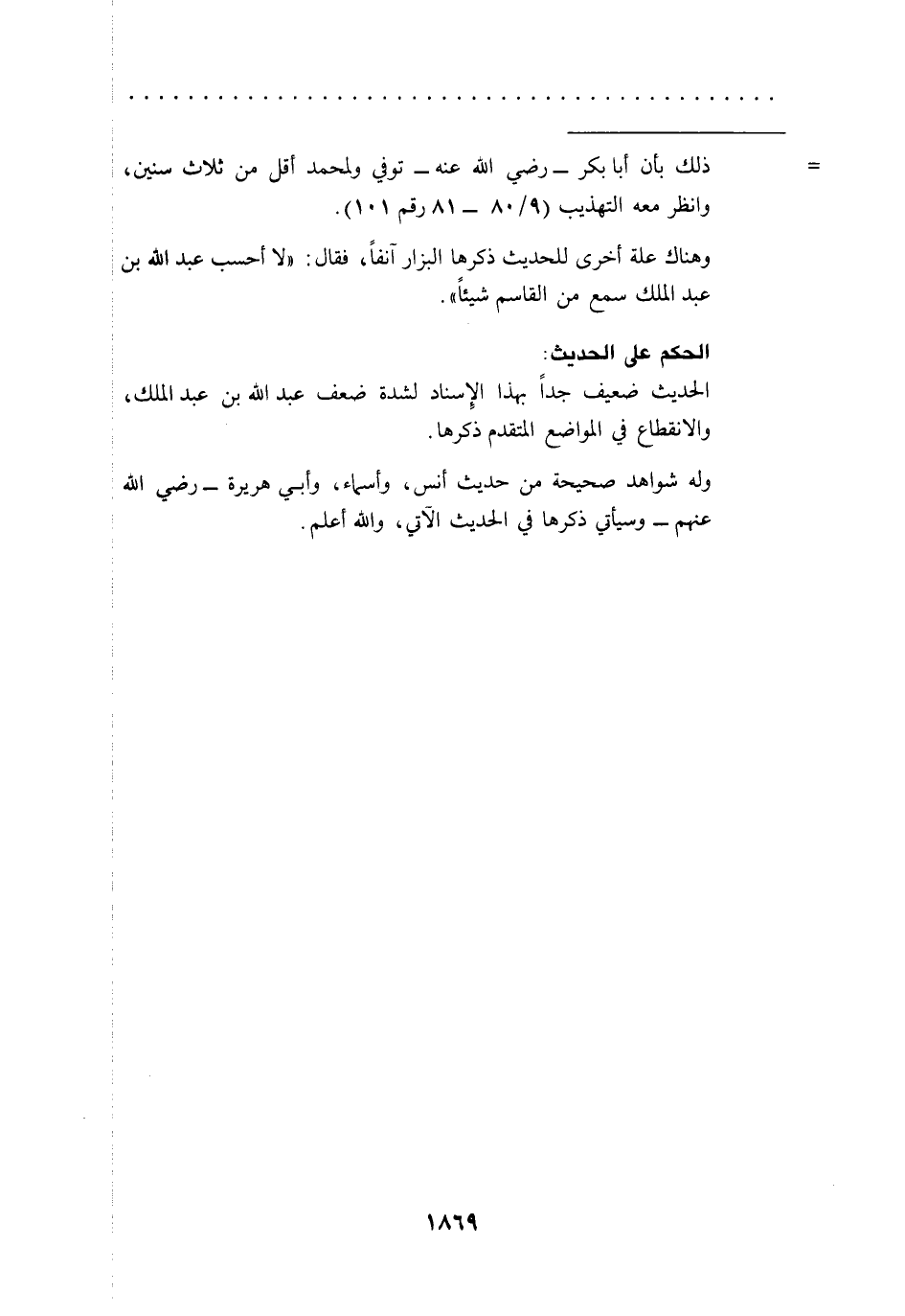 وهناك علة أخرى للحديث ذكرها البزار آنفاً، فقال: "لا أحسب عبد الله بن عبد الملك سمع من القاسم شيئاً".