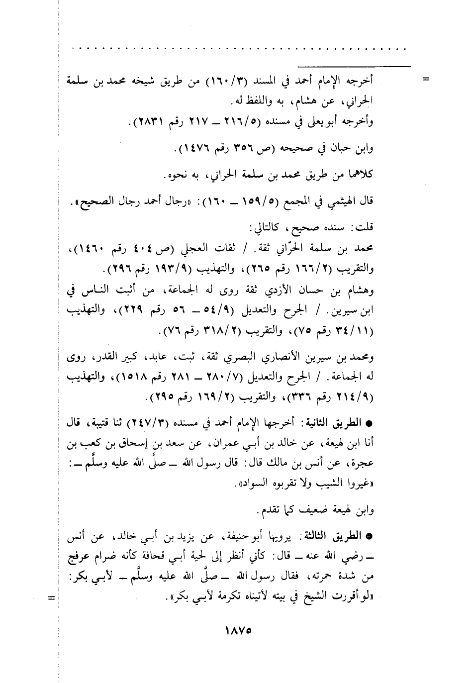 * الطريق الثالثة. يرويها أبو حنيفة، عن يزيد بن أبي خالد، عن أنس -رضي الله عنه- قال: كأني أنظر إلى لحية أبي قحافة كأنه ضرام عرفج من شدة حمرته، فقال رسول الله -صلى الله عليه وسلم- لأبي بكر: "لو أقررت الشيخ في بيته لأتيناه تكرمة لأبي بكر". =