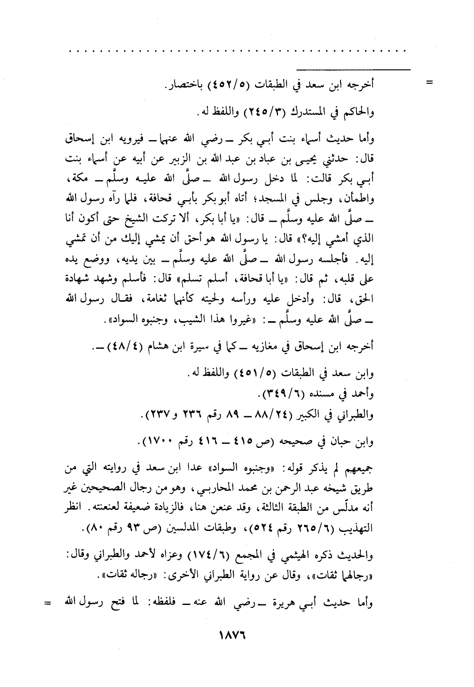 وأما حديث أسماء بنت أبي بكر -رضي الله عنهما- فيرويه ابن إسحاق قال: حدثني يحيى بن عباد بن عبد الله بن الزبير عن أبيه عن أسماء بنت أبي بكر قالت: لما دخل رسول الله -صلى الله عليه وسلم- مكة، واطمأن، وجلس في المسجد؛ أتاه أبو بكر بأبي قحافة، فلما رآه رسول الله -صلى الله عليه وسلم- قال: "يا أبا بكر، ألا تركت الشيخ حتى أكون أنا الذي أمشي إليه؟ " قال: يا رسول الله هو أحق أن يمشي إليك من أن تمشي إليه. فأجلسه رسول الله -صلى الله عليه وسلم- بين يديه، ووضع يده على قلبه، ثم قال: "يا أبا قحافة، أسلم تسلم" قال: فأسلم وشهد شهادة الحق، قال: وأدخل عليه ورأسه ولحيته كأنهما ثغامة، فقال رسول الله -صلى الله عليه وسلم-: "غيروا هذا الشيب، وجنبوه السواد".