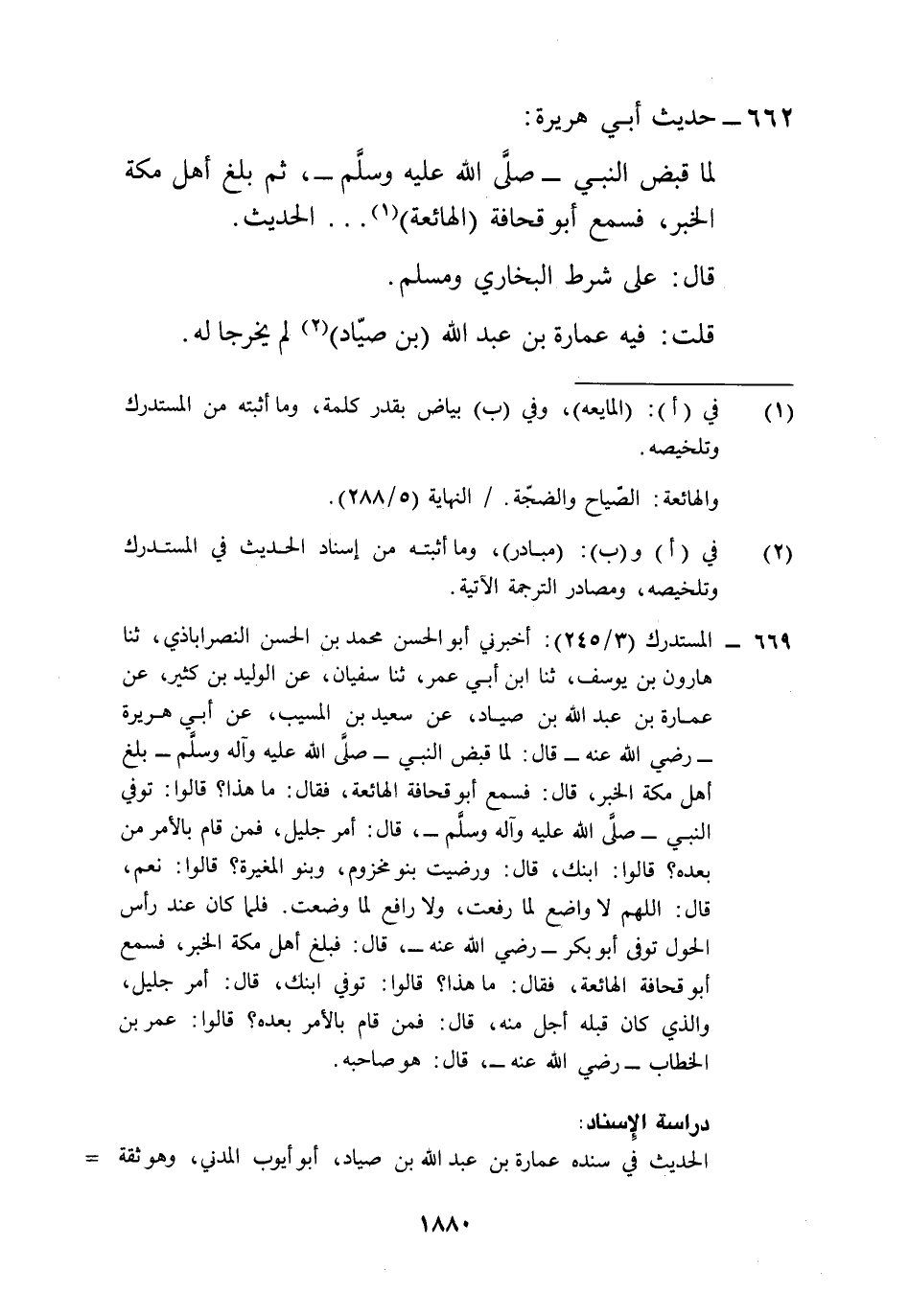 669 - المستدرك (3/ 245): أخبرني أبو الحسن محمد بن الحسن النصراباذي، ثنا هارون بن يوسف، ثنا ابن أبي عمر، ثنا سفيان، عن الوليد بن كثير، عن عمارة بن عبد الله بن صياد، عن سعيد بن المسيب، عن أبي هريرة -رضي الله عنه- قال: لما قبض النبي -صلى الله عليه وآله وسلم- بلغ أهل مكة الخبر، قال: فسمع أبو قحافة الهائعة، فقال: ما هذا؟ قالوا: توفي النبي -صلى الله عليه وآله وسلم-، قال: أمر جليل، فمن قام بالأمر من بعده؟ قالوا: ابنك، قال: ورضيت بنو مخزوم، وبنو المغيرة؟ قالوا: نعم، قال: اللهم لا واضع لما رفعت، ولا رافع لما وضعت. فلما كان عند رأس الحول توفى أبو بكر -رضي الله عنه -، قال: فبلغ أهل مكة الخبر، فسمع أبو قحافة الهائعة، فقال: ما هذا؟ قالوا: توفي ابنك، قال: أمر جليل، والذي كان قبله أجل منه، قال: فمن قام بالأمر بعده؟ قالوا: عمر بن الخطاب -رضي الله عنه-، قال: هو صاحبه.
