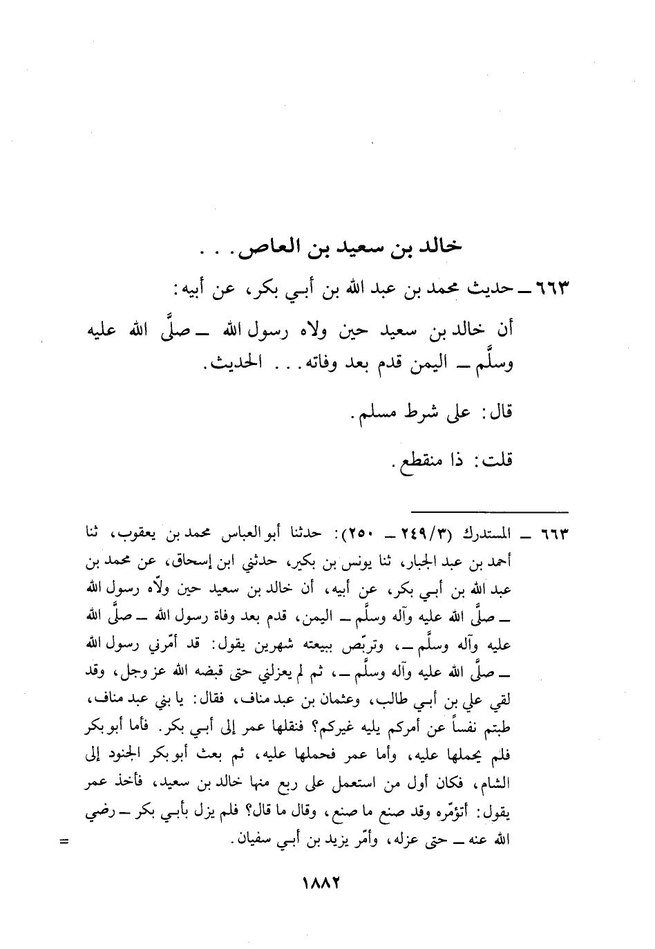 663 - المستدرك (3/ 249 - 250): حدثنا أبو العباس محمد بن يعقوب، ثنا أحمد بن عبد الجبار، ثنا يونس بن بكير، حدثني ابن إسحاق، عن محمد بن عبد الله بن أبي بكر، عن أبيه، أن خالد بن سعيد حين ولّاه رسول الله -صلى الله عليه وآله وسلم- اليمن، قدم بعد وفاة رسول الله -صلى الله عليه وآله وسلم-، وتربّص ببيعته شهرين يقول: قد أمّرني رسول الله -صلى الله عليه وآله وسلم-، ثم لم يعزلني حتى قبضه الله عز وجل، وقد لقي علي بن أبي طالب، وعثمان بن عبد مناف، فقال: يا بني عبد مناف، طبتم نفساً عن أمركم يليه غيركم؟ فنقلها عمر إلى أبي بكر. فأما أبو بكر فلم يحملها عليه، وأما عمر فحملها عليه، ثم بعث أبو بكر الجنود إلى الشام، فكان أول من استعمل على ربع منها خالد بن سعيد، فأخذ عمر يقول: أتؤمّره وقد صنع ما صنع، وقال ما قال؟ فلم يزل بأبي بكر -رضي الله عنه- حتى عزله، وأمّر يزيد بن أبي سفيان. =