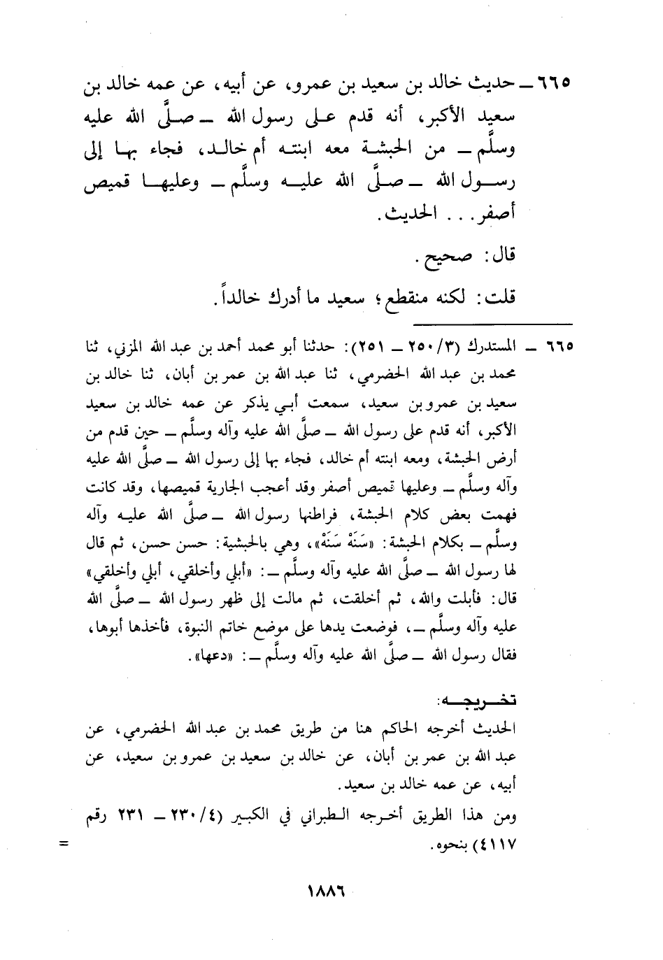 665 - المستدرك (3/ 250 - 251): حدثنا أبو محمد أحمد بن عبد الله المزني، ثنا محمد بن عبد الله الحضرمي، ثنا عبد الله بن عمر بن أبان، ثنا خالد بن سعيد بن عمرو بن سعيد، سمعت أبي يذكر عن عمه خالد بن سعيد الأكبر، أنه قدم على رسول الله -صلى الله عليه وآله وسلم- حين قدم من أرض الحبشة، ومعه ابنته أم خالد، فجاء بها إلى رسول الله -صلى الله عليه وآله وسلم- وعليها قميص أصفر وقد أعجب الجارية قميصها، وقد كانت فهمت بعض كلام الحبشة، فراطنها رسول الله -صلى الله عليه وآله وسلم- بكلام الحبشة: "سَنَهْ سَنَهْ"، وهي بالحبشية: حسن حسن، ثم قال لها رسول الله -صلَّى الله عليه وآله وسلم-: " أبلي وأخلقي، أبلي وأخلقي" قال: فأبلت والله، ثم أخلقت، ثم مالت إلى ظهر رسول الله -صلى الله عليه وآله وسلم-، فوضعت يدها على موضع خاتم النبوة، فأخذها أبوها، فقال رسول الله -صلى الله عليه وآله وسلَّم-: "دعها".