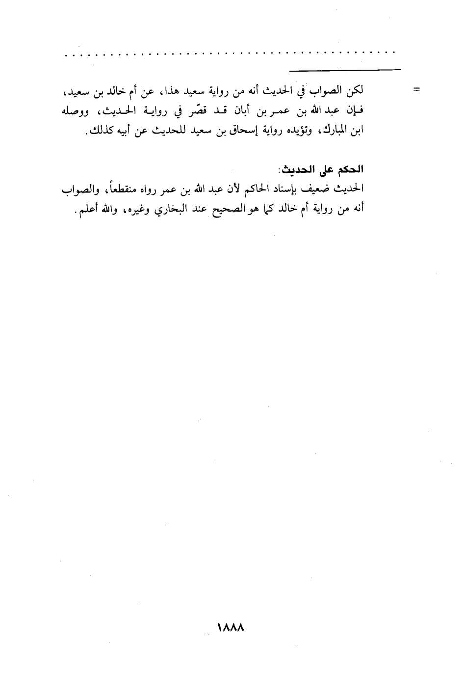 = لكن الصواب في الحديث أنه من رواية سعيد هذا، عن أم خالد بن سعيد، فإن عبد الله بن عمر بن أبان قد قصّر في رواية الحديث، ووصله ابن المبارك، وتؤيده رواية إسحاق بن سعيد للحديث عن أبيه كذلك.