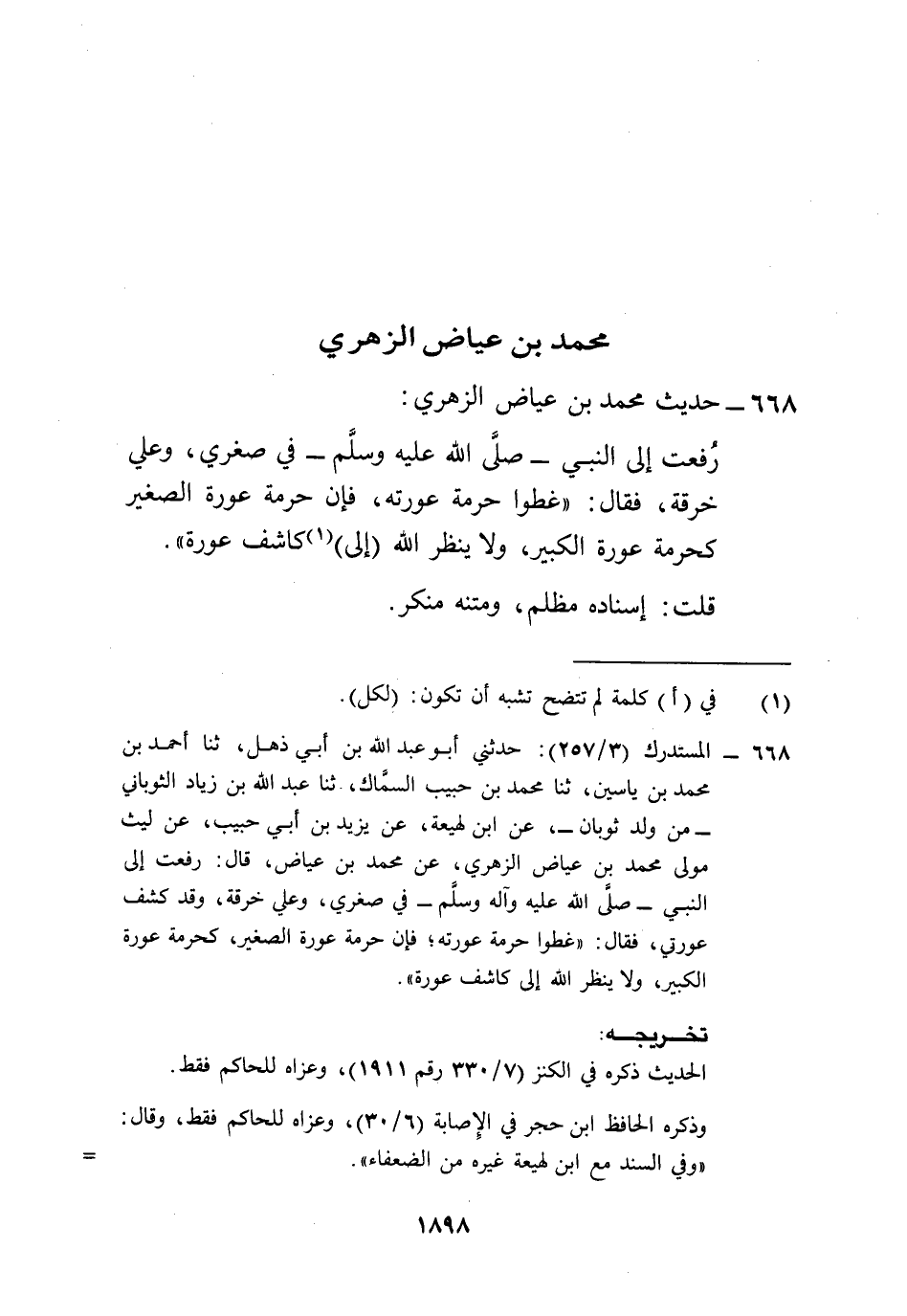668 - المستدرك (3/ 257): حدثني أبو عبد الله بن أبي ذهل، ثنا أحمد بن محمد بن ياسين، ثنا محمد بن حبيب السمَّاك، ثنا عبد الله بن زياد الثوباني -من ولد ثوبان-، عن ابن لهيعة، عن يزيد بن أبي حبيب، عن ليث مولى محمد بن عياض الزهري، عن محمد بن عياض، قال: رفعت إلى النبي -صلى الله عليه وآله وسلَّم- في صغري، وعلي خرقة، وقد كشف عورتي، فقال: "غطوا حرمة عورته؛ فإن حرمة عورة الصغير، كحرمة عورة الكبير، ولا ينظر الله إلى كاشف عورة".