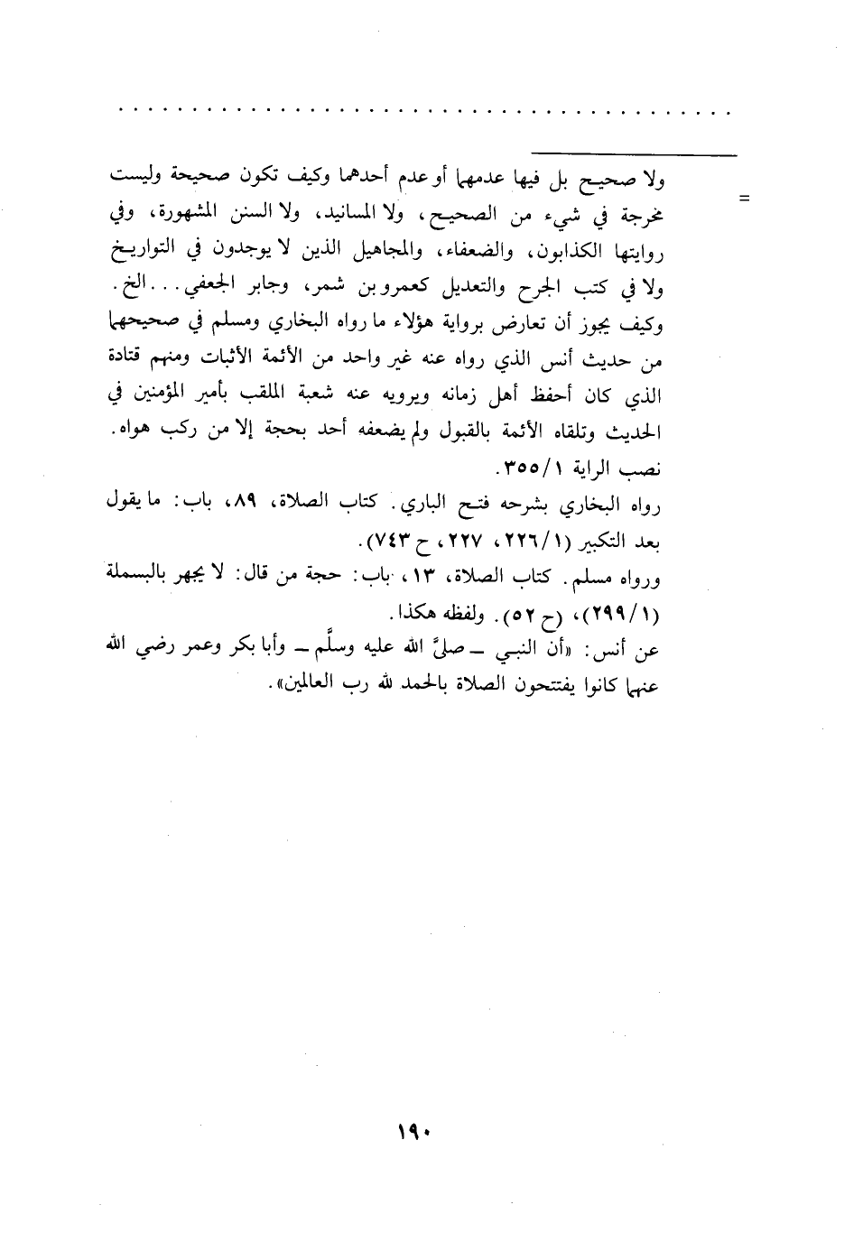 وكيف يجوز أن تعارض برواية هؤلاء ما رواه البخاري ومسلم في صحيحهما من حديث أنس الذي رواه عنه غير واحد من الأئمة الأثبات ومنهم قتادة الذي كان أحفظ أهل زمانه ويرويه عنه شعبة الملقب بأمير المؤمنين في الحديث وتلقاه الأئمة بالقبول ولم يضعفه أحد بحجة إلا من ركب هواه. نصب الراية 1/ 355.