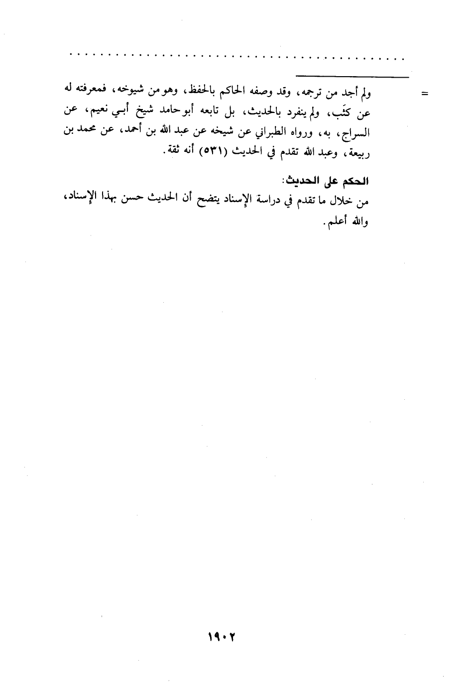 = ولم أجد من ترجمه، وقد وصفه الحاكم بالحفظ، وهو من شيوخه، فمعرفته له عن كثَب، ولم ينفرد بالحديث، بل تابعه أبو حامد شيخ أبي نعيم، عن السراج، به، ورواه الطبراني عن شيخه عن عبد الله بن أحمد، عن محمد بن ربيعة، وعبد الله تقدم في الحديث (531) أنه ثقة.