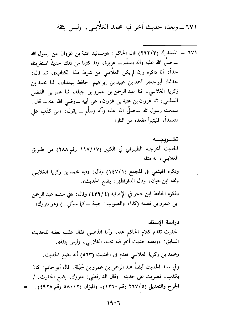 671 - المستدرك (3/ 262) قال الحاكم: "ومسانيد عتبة بن غزوان عن رسول الله -صلى الله عليه وآله وسلم- عزيزة، وقد كتبنا من ذلك حديثاً استغربناه جداً: أنا ذاكره وإن لم يكن الغلاَّبي من شرط هذا الكتاب"، ثم قال: حدثناه أبو جعفر أحمد بن عبيد بن إبراهيم الحافظ بهمدان، ثنا محمد بن زكريا الغلابي، ثنا عبد الرحمن بن عمرو بن جبلة، ثنا عمر بن الفضل السلمي، ثنا غزوان بن عتبة بن غزوان، عن أبيه -رضي الله عنه- قال: سمعت رسول الله -صلى الله عليه وآله وسلم- يقول: "من كذب علي متعمداً، فليتبوأ مقعده من النار".