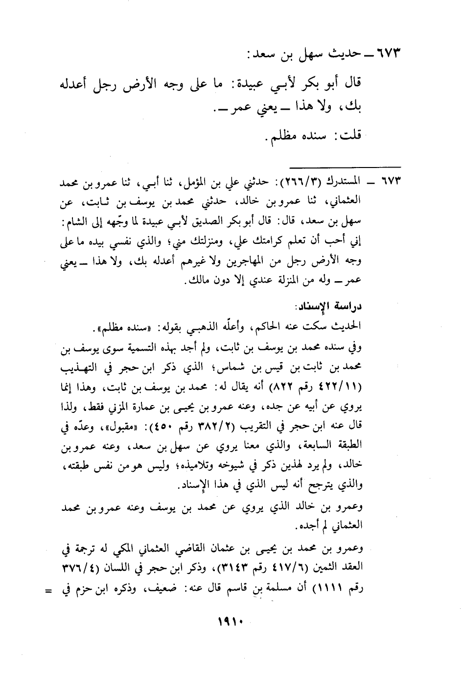 673 - المستدرك (3/ 266): حدثني علي بن المؤمل، ثنا أبي، ثنا عمرو بن محمد العثماني، ثنا عمرو بن خالد، حدثني محمد بن يوسف بن ثابت، عن سهل بن سعد، قال: قال أبو بكر الصديق لأبي عبيدة لما وجّهه إلى الشام: إني أحب أن تعلم كرامتك علي، ومنزلتك مني؛ والذي نفسي بيده ما على وجه الأرض رجل من المهاجرين ولا غيرهم أعدله بك، ولا هذا -يعني عمر- وله من المنزلة عندي إلا دون مالك.