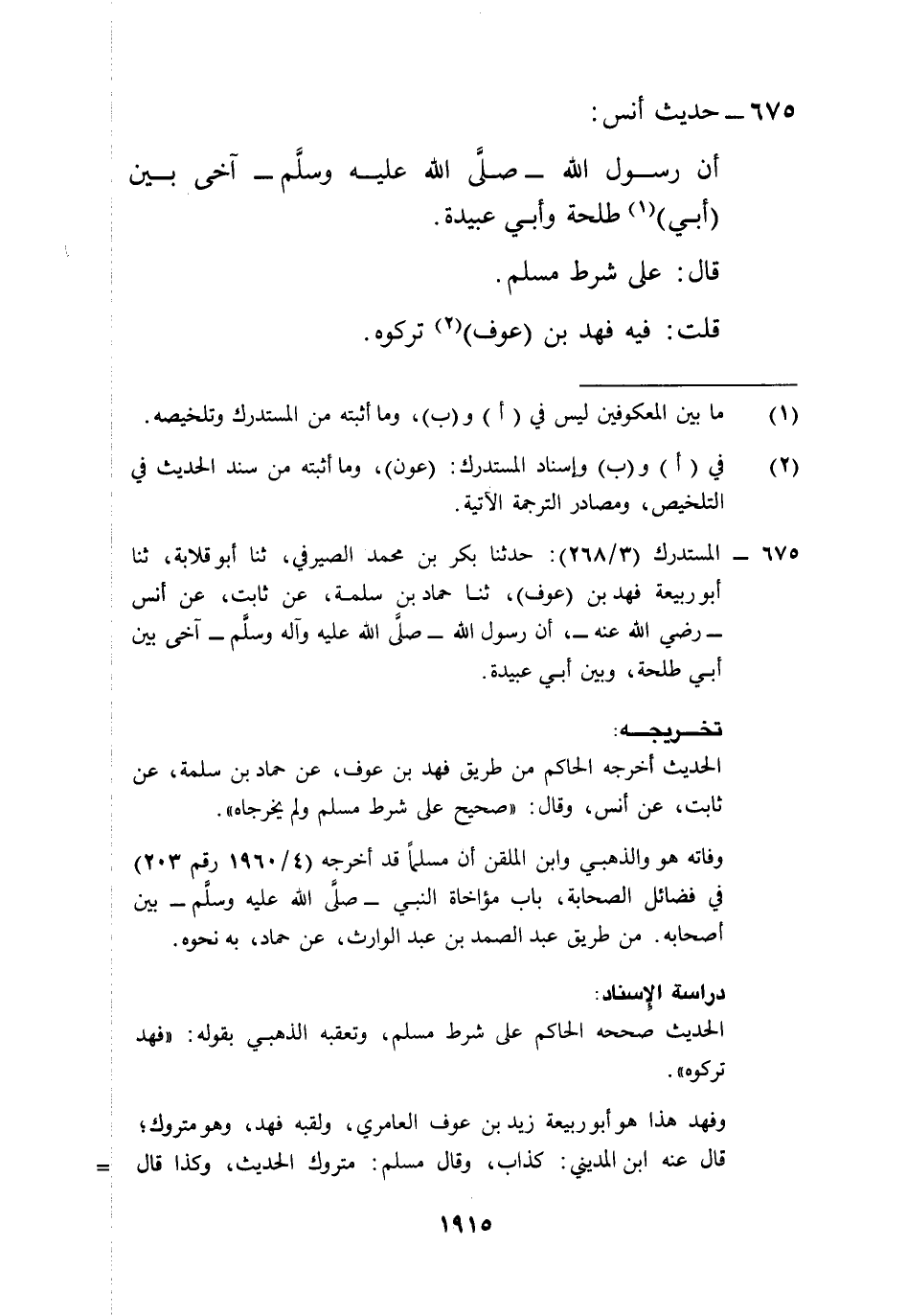 675 - المستدرك (3/ 268): حدثنا بكر بن محمد الصيرفي، ثنا أبو قلابة، ثنا أبو ربيعة فهد بن (عوف)، ثنا حماد بن سلمة، عن ثابت، عن أنس -رضي الله عنه-، أن رسول الله -صلى الله عليه وآله وسلم- آخى بين أبي طلحة، وبين أبي عبيدة.