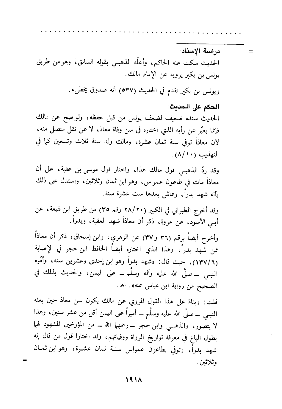 قلت: وبناءً على هذا القول المروي عن مالك يكون سن معاذ حين بعثه النبي -صلَّى الله عليه وسلَّم- أميراً على اليمن أقل من عشر سنين، وهذا لا يتصور، والذهبي وابن حجر -رحمهما الله- من المؤرخين المشهود لهما بطول الباع في معرفة تواريخ الرواة ووفياتهم، وقد اختارا قول من قال إنه شهد بدراً، وتوفي بطاعون عمواس سنة ثمان عشرة، وهو ابن ثمان وثلاثين. =