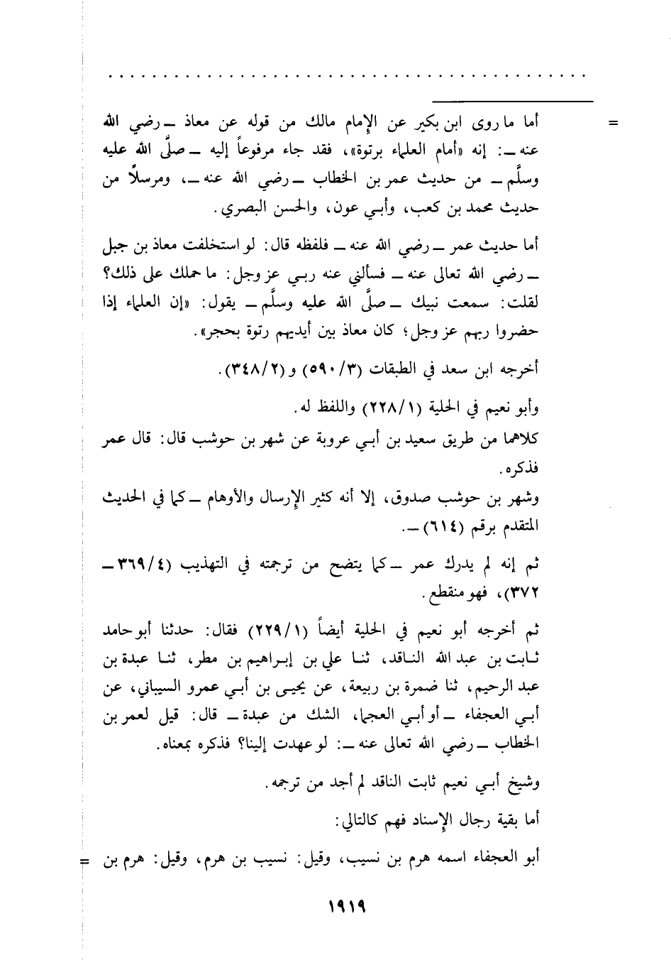 = أما ما روى ابن بكير عن الِإمام مالك من قوله عن معاذ -رضي الله عنه-: إنه "أمام العلماء برتوة"، فقد جاء مرفوعاً إليه -صلى الله عليه وسلم- من حديث عمر بن الخطاب -رضي الله عنه -، ومرسلاً من حديث محمد بن كعب، وأبي عون، والحسن البصري.