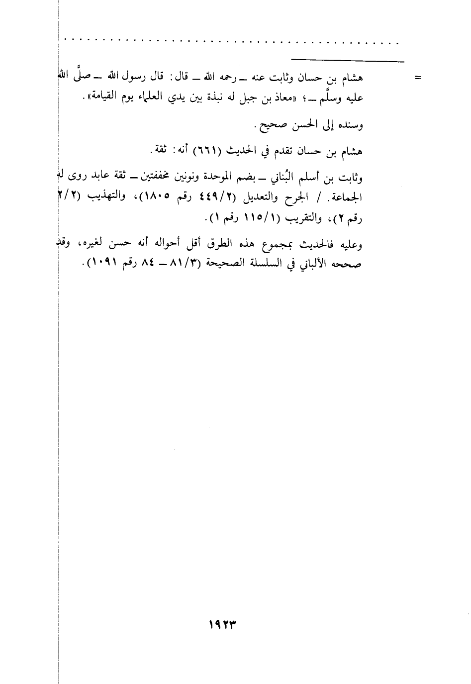 = هشام بن حسان وثابت عنه -رحمه الله- قال: قال: رسول الله -صلى الله عليه وسلم-؛ "معاذ بن جبل له نبذة بين يدي العلماء يوم القيامة".
