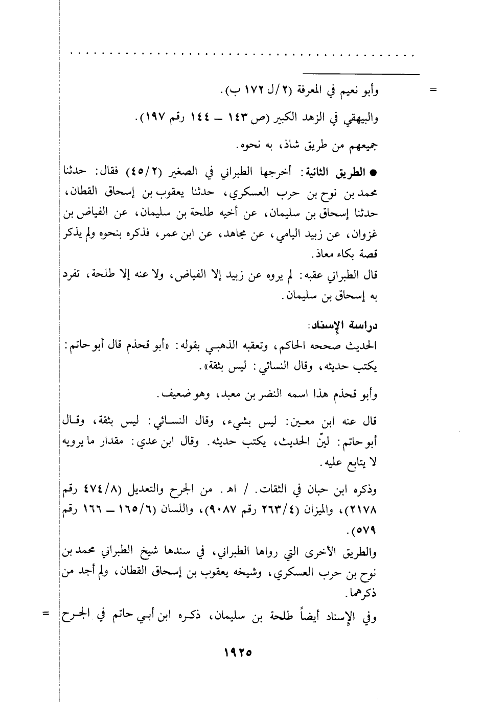 * الطريق الثانية: أخرجها الطبراني في الصغير (2/ 45) فقال: حدثنا محمد بن نوح بن حرب العسكري، حدثنا يعقوب بن إسحاق القطان، حدثنا إسحاق بن سليمان، عن أخيه طلحة بن سليمان، عن الفياض بن غزوان، عن زبيد اليامي، عن مجاهد، عن ابن عمر، فذكره بنحوه ولم يذكر قصة بكاء معاذ.