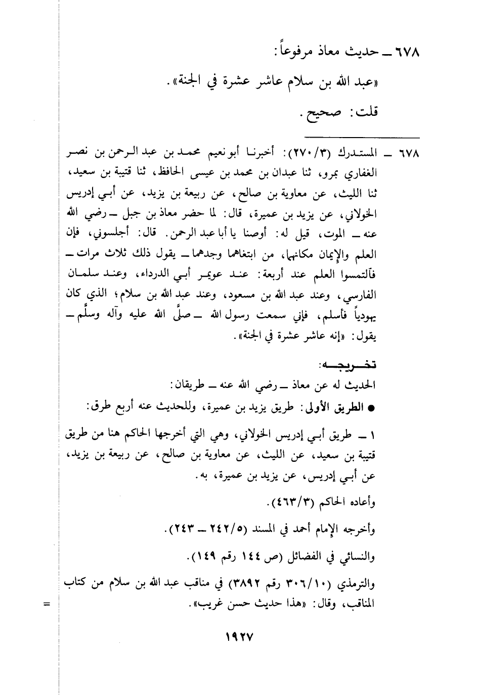 678 - المستدرك (3/ 270): أخبرنا أبو نعيم محمد بن عبد الرحمن بن نصر الغفاري بمرو، ثنا عبدان بن محمد بن عيسى الحافظ، ثنا قتيبة بن سعيد، ثنا الليث، عن معاوية بن صالح، عن ربيعة بن يزيد، عن أبي إدريس الخولاني، عن يزيد بن عميرة، قال: لما حضر معاذ بن جبل -رضي الله عنه- الموت، قيل له: أوصنا يا أبا عبد الرحمن. قال: أجلسوني، فإن العلم والِإيمان مكانهما، من ابتغاهما وجدهما -يقول ذلك ثلاث مرات- فآلتمسوا العلم عند أربعة: عند عويمر أبي الدرداء، وعند سلمان الفارسي، وعند عبد الله بن مسعود، وعند عبد الله بن سلام؛ الذي كان يهودياً فأسلم، فإني سمعت رسول الله -صلى الله عليه وآله وسلم- يقول: "إنه عاشر عشرة في الجنة".