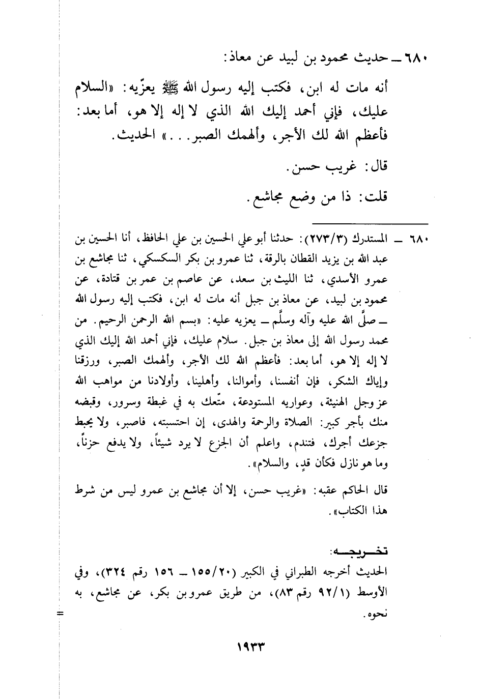 680 - المستدرك (3/ 273): حدثنا أبو علي الحسين بن علي الحافظ، أنا الحسين بن عبد الله بن يزيد القطان بالرقة، ثنا عمرو بن بكر السكسكي، ثنا مجاشع بن عمرو الأسدي، ثنا الليث بن سعد، عن عاصم بن عمر بن قتادة، عن محمود بن لبيد، عن معاذ بن جبل أنه مات له ابن، فكتب إليه رسول الله -صلى الله عليه وآله وسلم- يعزيه عليه: "بسم الله الرحمن الرحيم. من محمد رسول الله إلى معاذ بن جبل. سلام عليك، فإني أحمد الله إليك الذي لا إله إلا هو، أما بعد: فأعظم الله لك الأجر، وألهمك الصبر، ورزقنا وإياك الشكر، فإن أنفسنا، وأموالنا، وأهلينا، وأولادنا من مواهب الله عز وجل الهنيئة، وعواريه المستودعة، متّعك به في غبطة وسرور، وقبضه منك بأجر كبير: الصلاة والرحمة والهدى، إن احتسبته، فاصبر، ولا يحبط جزعك أجرك، فتندم، واعلم أن الجزع لا يرد شيئاً، ولا يدفع حزناً، وما هو نازل فكأن قدٍ، والسلام".