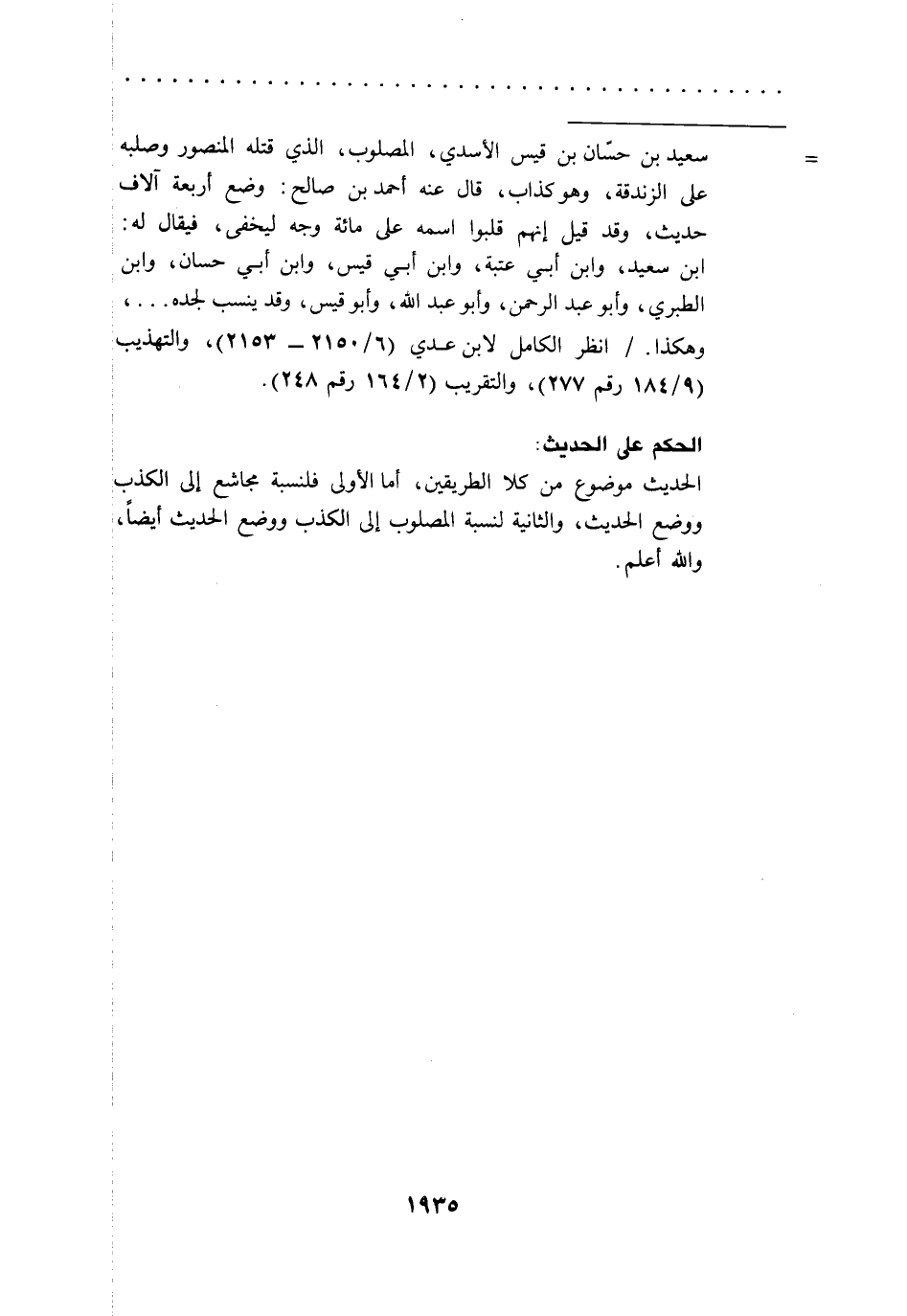 = سعيد بن حسّان بن قيس الأسدي، المصلوب، الذي قتله المنصور وصلبه على الزندقة، وهو كذاب، قال عنه أحمد بن صالح: وضع أربعة آلاف حديث، وقد قيل إنهم قلبوا اسمه على مائة وجه ليخفى، فيقال له: ابن سعيد، وابن أبي عتبة، وابن أبي قيس، وابن أبي حسان، وابن الطبري، وأبو عبد الرحمن، وأبو عبد الله، وأبو قيس، وقد ينسب لجده ... ، وهكذا./ انظر الكامل لابن عدي (6/ 2150 - 2153)، والتهذيب (9/ 184رقم 277)، والتقريب (2/ 164رقم 248).