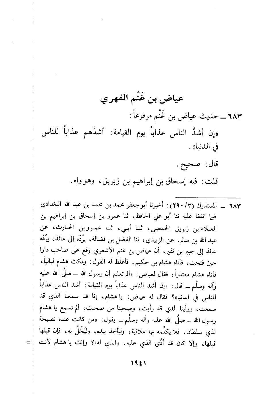 683 - المستدرك (3/ 290): أخبرنا أبو جعفر محمد بن محمد بن عبد الله البغدادي فيما اتفقا عليه ثنا أبو علي الحافظ، ثنا عمرو بن إسحاق بن إبراهيم بن العلاء بن زبريق الحمصي، ثنا أبي، ثنا عمرو بن الحارث، عن عبد الله بن سالم، عن الزبيدي، ثنا الفضل بن فضالة، يرُدّه إلى عائذ، يرُدّه عائذ إلى جبير بن نفير، أن عياض بن غنم الأشعري وقع على صاحب دارا حين فتحت، فأتاه هشام بن حكيم، فأغلظ له القول: ومكث هشام ليالياً، فأتاه هشام معتذراً، فقال لعياض: "ألم تعلم أن رسول الله -صلى الله عليه وآله وسلم- قال: "إن أشد الناس عذاباً يوم القيامة: أشد الناس عذاباً للناس في الدنيا"؟ فقال له عياض: يا هشام، إنا قد سمعنا الذي قد سمعت، ورأينا الذي قد رأيت، وصحبنا من صحبت، ألم تسمع يا هشام رسول الله -صلى الله عليه وآله وسلم- يقول: "من كانت عنده نصيحة لذي سلطان، فلا يكلِّمه بها علانية، وليأخذ بيده، ولَيَخْلُ به، فإن قبلها قبلها، وإلا كان قد أدَّى الذي عليه، والذي له"؟ وإنك يا هشام لأنت =