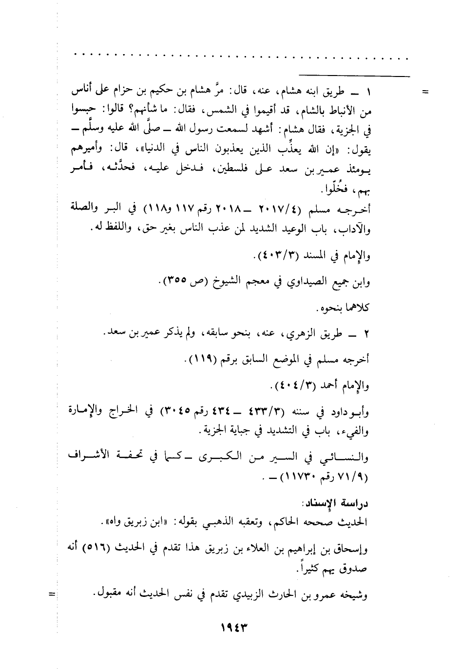 = 1 - طريق ابنه هشام، عنه، قال: مرَّ هشام بن حكيم بن حزام على أناس من الأنباط بالشام، قد أقيموا في الشمس، فقال: ما شأنهم؟ قالوا: حبسوا في الجزية، فقال هشام: أشهد لسمعت رسول الله -صلى الله عليه وسلم- يقول: "إن الله يعذِّب الذين يعذبون الناس في الدنيا"، قال: وأميرهم يومئذ عمير بن سعد على فلسطين، فدخل عليه، فحدَّثه، فأمر بهم، فخُلّوا.