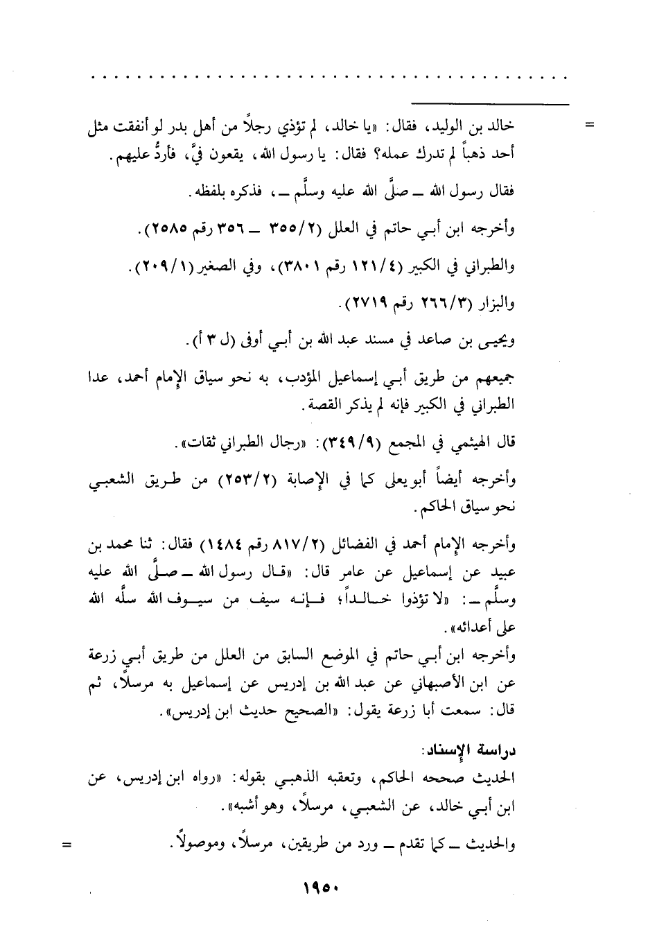 = خالد بن الوليد، فقال: "يا خالد، لم تؤذي رجلاً من أهل بدر لو أنفقت مثل أحد ذهباً لم تدرك عمله؟ فقال: يا رسول الله، يقعون فيَّ، فأردُّ عليهم.