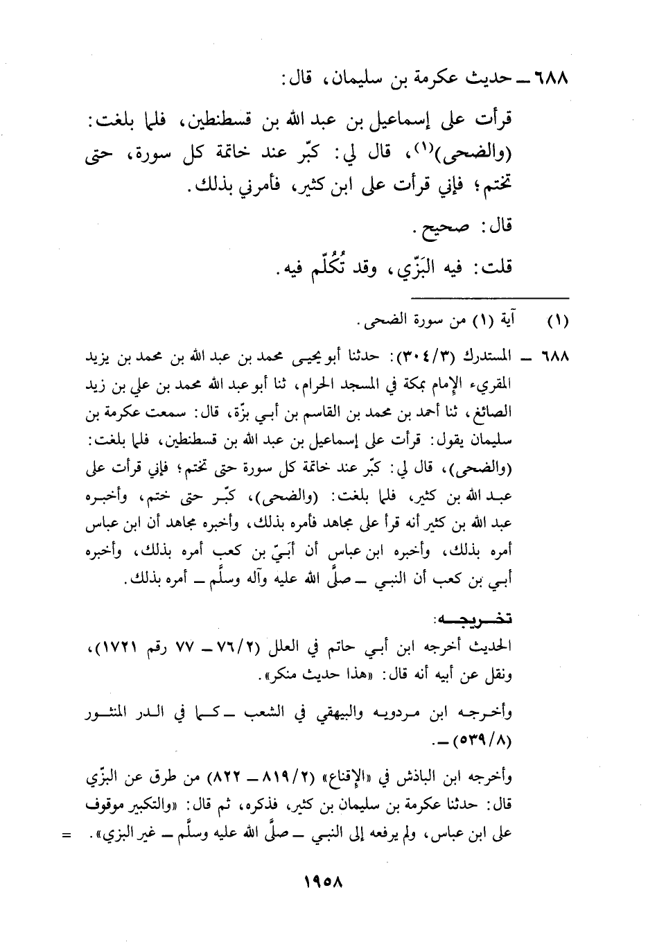 688 - المستدرك (3/ 304): حدثنا أبو يحيى محمد بن عبد الله بن محمد بن يزيد المقريء الِإمام بمكة في المسجد الحرام، ثنا أبو عبد الله محمد بن علي بن زيد الصائغ، ثنا أحمد بن محمد بن القاسم بن أبي بزّة، قال: سمعت عكرمة بن سليمان يقول: قرأت على إسماعيل بن عبد الله بن قسطنطين، فلما بلغت: (والضحى)، قال لي: كبّر عند خاتمة كل سورة حتى تختم، فإني قرأت على عبد الله بن كثير، فلما بلغت: (والضحى)، كبّر حتى ختم، وأخبره عبد الله بن كثير أنه قرأ على مجاهد فأمره بذلك، وأخبره مجاهد أن ابن عباس أمره بذلك، وأخبره ابن عباس أن أبَيّ بن كعب أمره بذلك، وأخبره أبي بن كعب أن النبي -صلى الله عليه وآله وسلم- أمره بذلك.