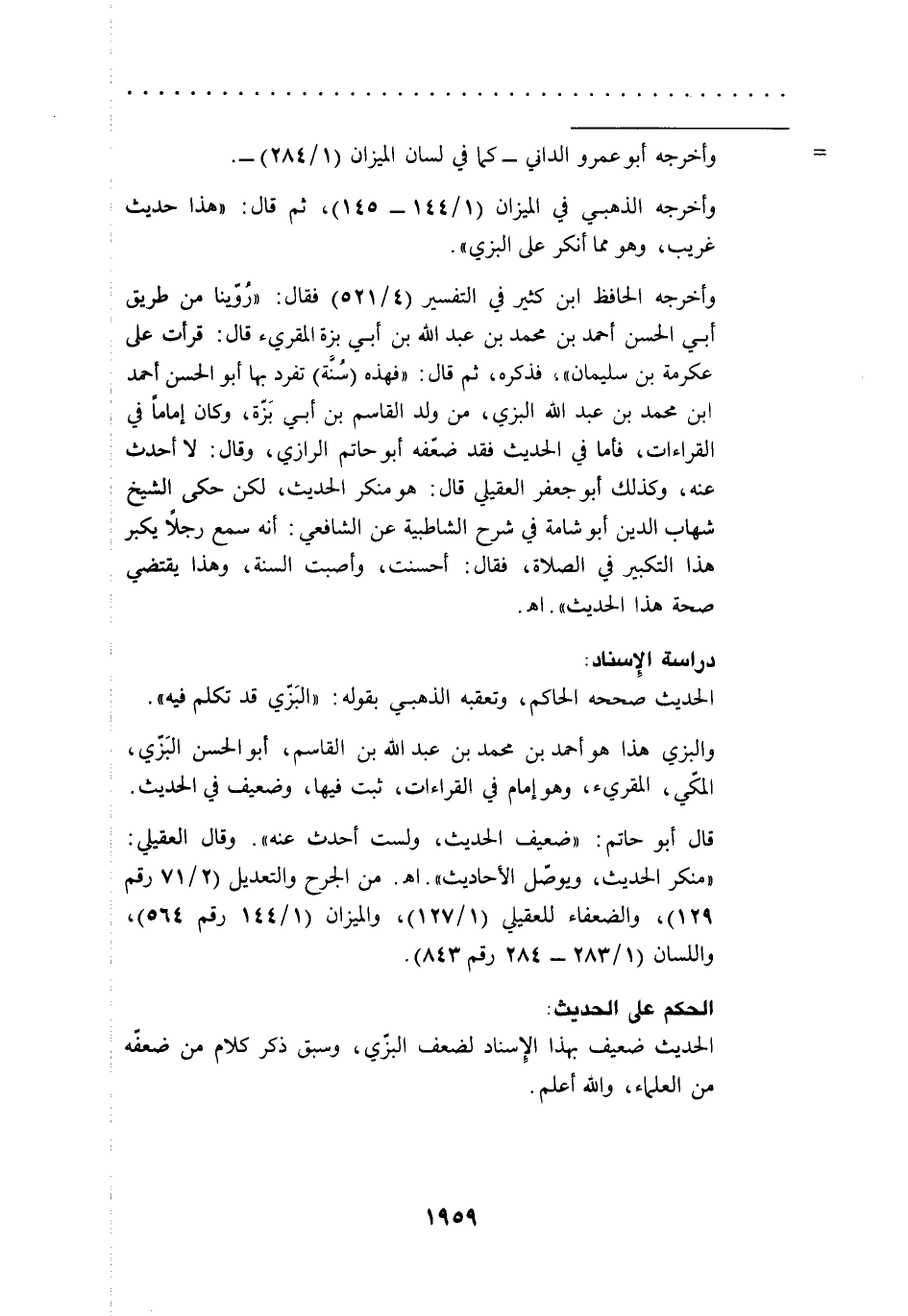 وأخرجه الحافظ ابن كثير في التفسير (4/ 521) فقال: "رُوّينا من طريق أبي الحسن أحمد بن محمد بن عبد الله بن أبي بزة المقريء قال: قرأت على عكرمة بن سليمان"، فذكره، ثم قال: "فهذه (سُنَّة) تفرد بها أبو الحسن أحمد ابن محمد بن عبد الله البزي، من ولد القاسم بن أبي بَزّة، وكان إماماً في القراءات، فأما في الحديث فقد ضعّفه أبو حاتم الرازي، وقال: لا أحدث عنه، وكذلك أبو جعفر العقيلي قال: هو منكر الحديث، لكن حكى الشيخ شهاب الدين أبو شامة في شرح الشاطبية عن الشافعي: أنه سمع رجلاً يكبر هذا التكبير في الصلاة، فقال: أحسنت، وأصبت السنة، وهذا يقتضي صحة هذا الحديث". اهـ.