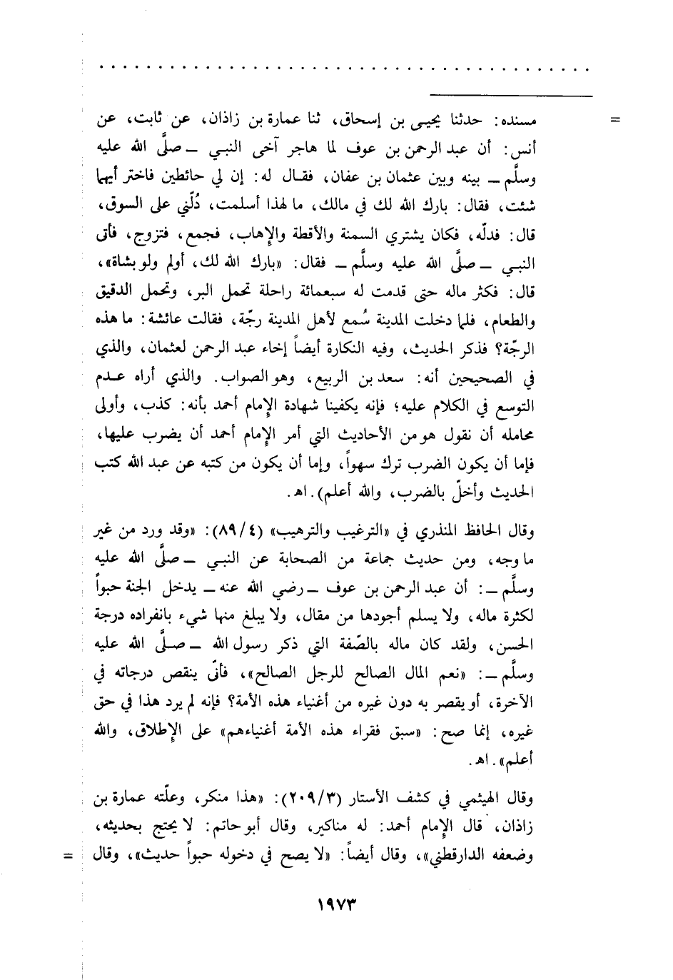 = مسنده: حدثنا يحيى بن إسحاق، ثنا عمارة بن زاذان، عن ثابت، عن أنس: أن عبد الرحمن بن عوف لما هاجر آخى النبي -صلى الله عليه وسلم- بينه وبين عثمان بن عفان، فقال له: إن لي حائطين فاختر أيهما شئت، فقال: بارك الله لك في مالك، ما لهذا أسلمت، دُلّني على السوق، قال: فدلّه، فكان يشتري السمنة والأقطة والِإهاب، فجمع، فتزوج، فأتى النبي -صلى الله عليه وسلم- فقال: "بارك الله لك، أولم ولو بشاة"، قال: فكثر ماله حتى قدمت له سبعمائة راحلة تحمل البر، وتحمل الدقيق والطعام، فلما دخلت المدينة سمع لأهل المدينة رجّة، فقالت عائشة: ما هذه الرجّة؟ فذكر الحديث، وفيه النكارة أيضاً إخاء عبد الرحمن لعثمان، والذي في الصحيحين أنه: سعد بن الربيع، وهو الصواب. والذي أراه عدم التوسع في الكلام عليه؛ فإنه يكفينا شهادة الِإمام أحمد بأنه: كذب، وأولى محامله أن نقول هو من الأحاديث التي أمر الِإمام أحمد أن يضرب عليها، فإما أن يكون الضرب ترك سهواً، وإما أن يكون من كتبه عن عبد الله كتب الحديث وأخلّ بالضرب، والله أعلم). اهـ.