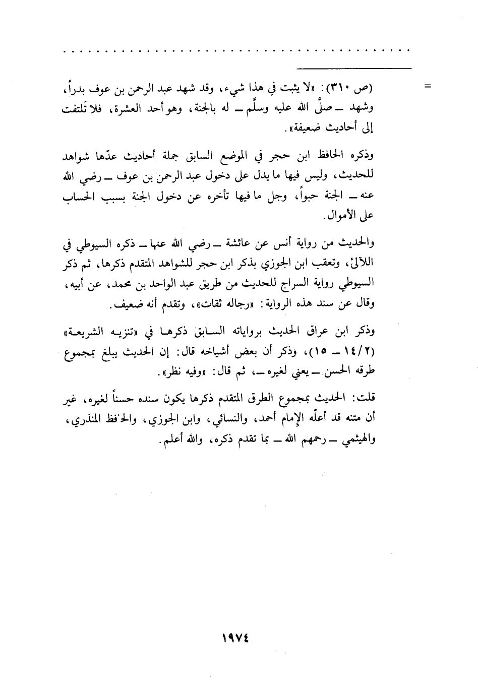 = (ص 310): "لا يثبت في هذا شيء، وقد شهد عبد الرحمن بن عوف بدراً، وشهد -صلى الله عليه وسلم- له بالجنة، وهو أحد العشرة، فلا تَلتفت إلى أحاديث ضعيفة".
