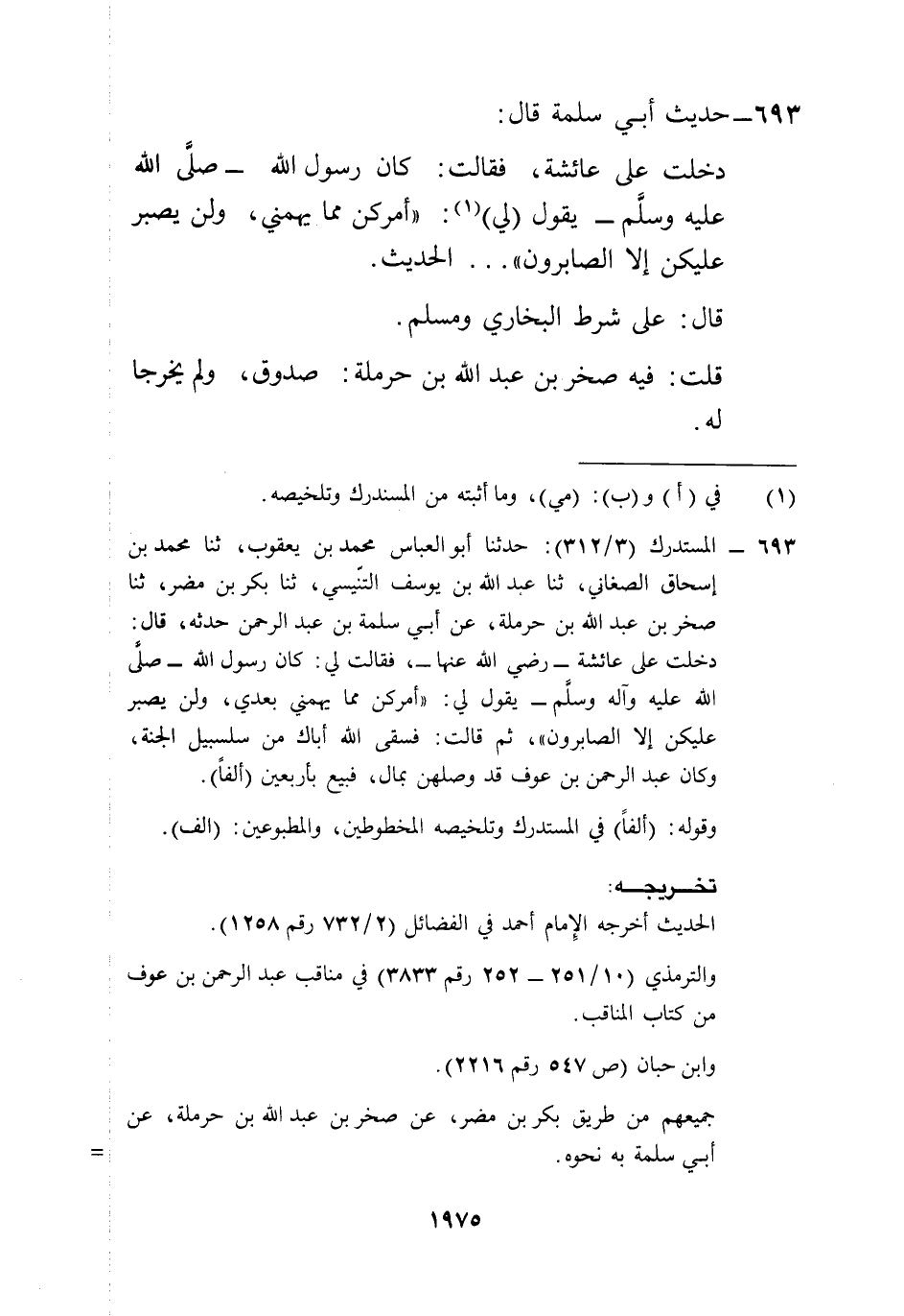 693 - المستدرك (3/ 312): حدثنا أبو العباس محمد بن يعقوب، ثنا محمد بن إسحاق الصغاني، ثنا عبد الله بن يوسف التنّيسي، ثنا بكر بن مضر، ثنا صخر بن عبد الله بن حرملة، عن أبي سلمة بن عبد الرحمن حدثه، قال: دخلت على عائشة -رضي الله عنها-، فقالت لي: كان رسول الله -صلى الله عليه وآله وسلم- يقول لي: "أمركن مما يهمني بعدي، ولن يصبر عليكن إلا الصابرون"، ثم قالت: فسقى الله أباك من سلسبيل الجنة، وكان عبد الرحمن بن عوف قد وصلهن بمال، فبيع بأربعين (ألفاً).