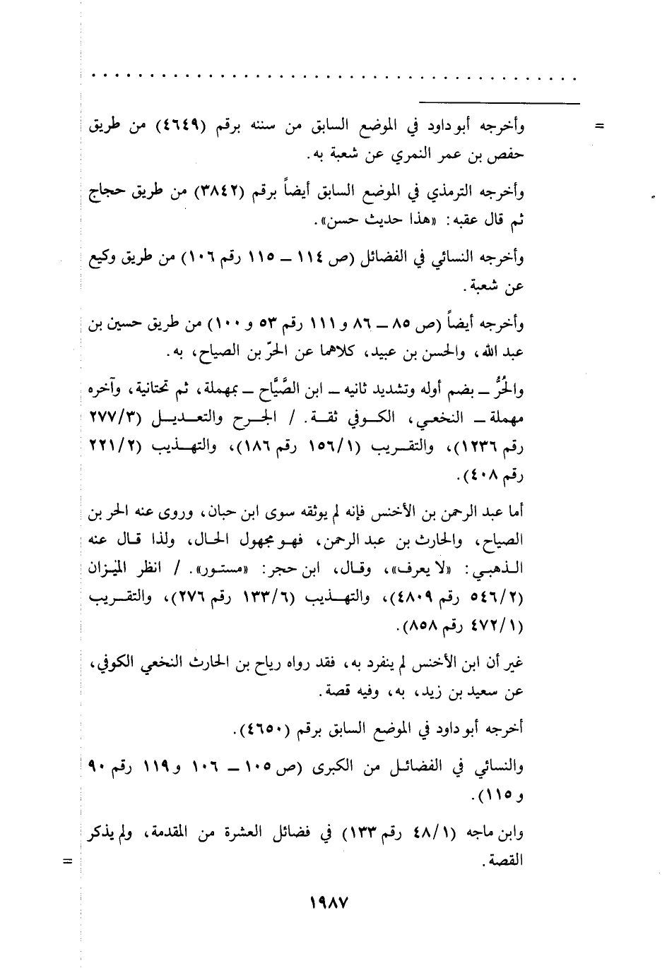 وأخرجه أيضاً (ص 85 - 86 و 111 رقم 53 و 100) من طريق حسين بن عبد الله، والحسن بن عبيد، كلاهما عن الحّر بن الصياح، به.