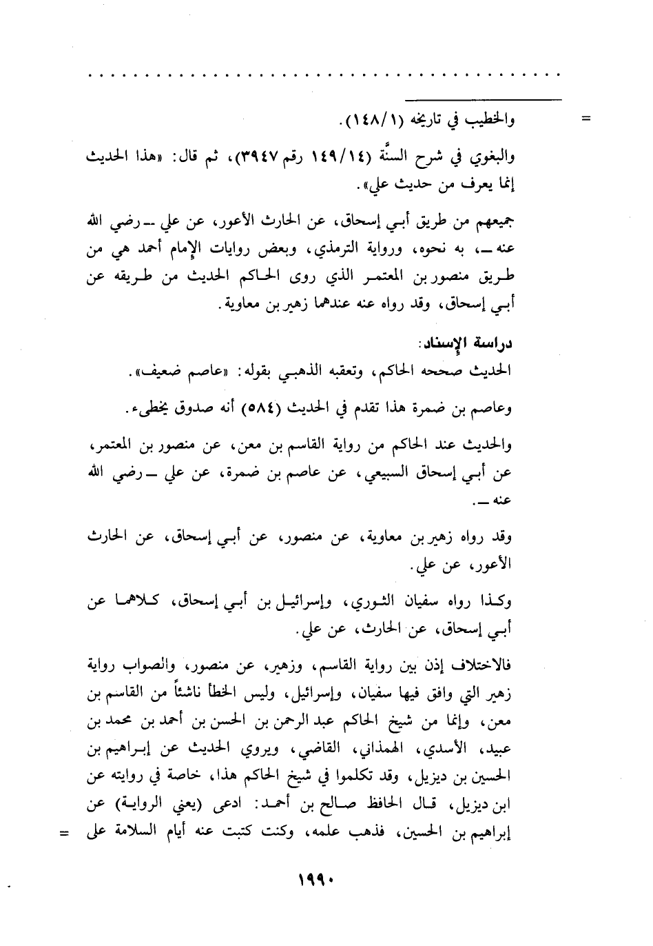 فالاختلاف إذن بين رواية القاسم، وزهير، عن منصور، والصواب رواية زهير التي وافق فيها سفيان، وإسرائيل، وليس الخطأ ناشئاً من القاسم بن معن، وإنما من شيخ الحاكم عبد الرحمن بن الحسن بن أحمد بن محمد بن عبيد، الأسدي، الهمذاني، القاضي، ويروي الحديث عن إبراهيم بن الحسين بن ديزيل، وقد تكلموا في شيخ الحاكم هذا، خاصة في روايته عن ابن ديزيل، قال الحافظ صالح بن أحمد: ادعى (يعني الرواية) عن إبراهيم بن الحسين، فذهب علمه، وكنت كتبت عنه أيام السلامة على =