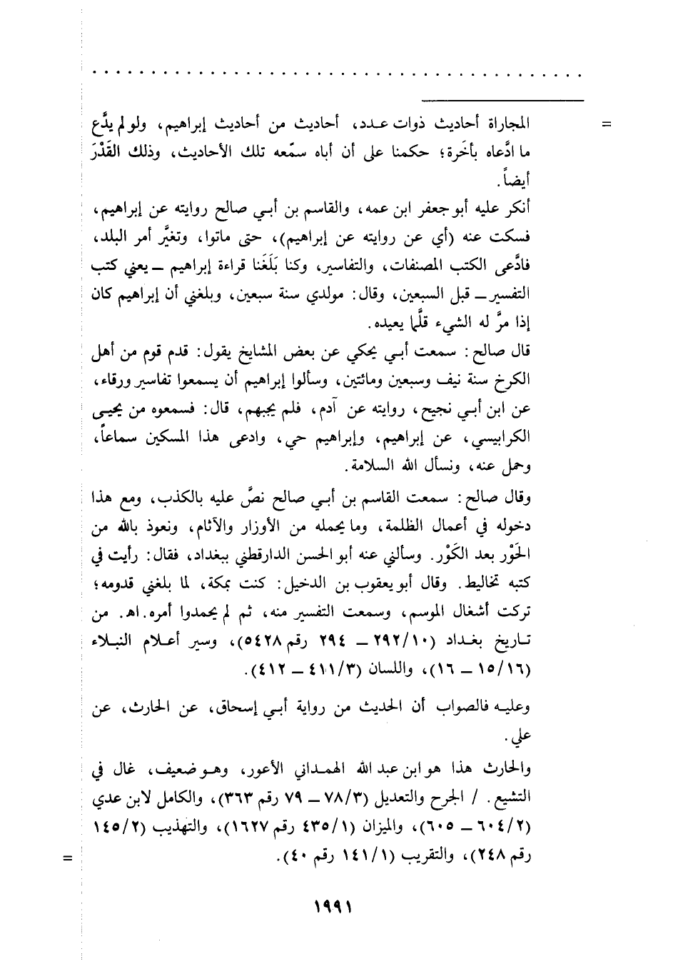 وقال صالح: سمعت القاسم بن أبي صالح نصَّ عليه بالكذب، ومع هذا دخوله في أعمال الظلمة، وما يحمله من الأوزار والآثام، ونعوذ بالله من الحَوْر بعد الكَوْر. وسألني عنه أبو الحسن الدارقطني ببغداد، فقال: رأيت في كتبه تخاليط. وقال أبو يعقوب بن الدخيل: كنت بمكة، لما بلغني قدومه؛ تركت أشغال الموسم، وسمعت التفسير منه، ثم لم يحمدوا أمره. اهـ. من تاريخ بغداد (10/ 292 - 294 رقم 5428)، وسير أعلام النبلاء (16/ 15 - 16)، واللسان (3/ 411 - 412).