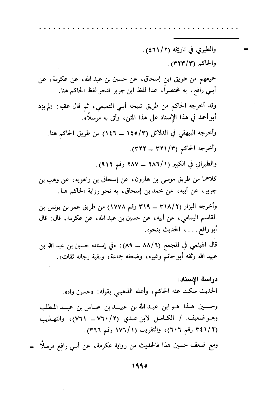 جميعهم من طريق ابن إسحاق، عن حسين بن عبد الله، عن عكرمة، عن أبي رافع، به مختصراً، عدا لفظ ابن جرير فنحو لفظ الحاكم هنا.