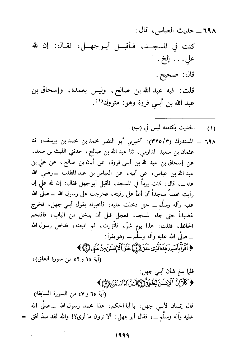 698 - المستدرك (3/ 325): أخبرني أبو النضر محمد بن محمد بن يوسف، ثنا عثمان بن سعيد الدارمي، ثنا عبد الله بن صالح، حدثني الليث بن سعد، عن إسحاق بن عبد الله بن أبي فروة، عن أبان بن صالح، عن علي بن عبد الله بن عباس، عن أبيه، عن العباس بن عبد المطلب -رضي الله عنه-، قال: كنت يوماً في المسجد، فأقبل أبو جهل فقال: إن لله علي إن رأيت محمداً ساجداً أن أطأ على رقبته، فخرجت على رسول الله -صلى الله عليه وآله وسلم- حتى دخلت عليه، فأخبرته بقول أبي جهل، فخرج غضباناً حتى جاء المسجد، فعجل قبل أن يدخل من الباب، فاقتحم الحائط، فقلت: هذا يوم شرّ، فاتّزرت، ثم اتبعته، فدخل رسول الله -صلى الله عليه وآله وسلم- وهو يقرأ: