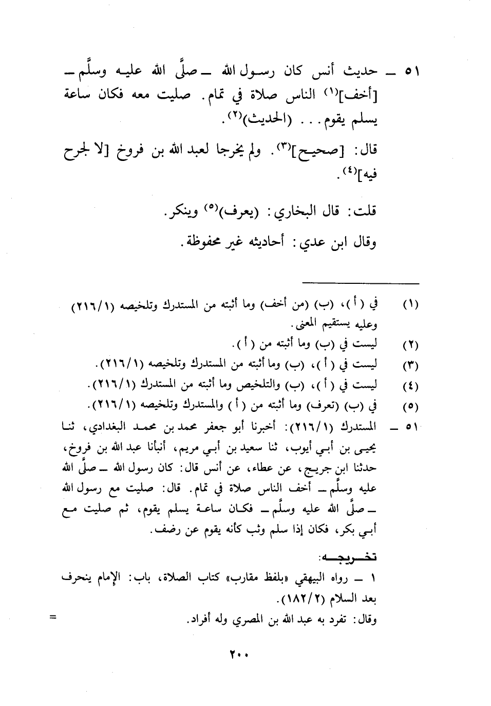 51 - المستدرك (1/ 216): أخبرنا أبو جعفر محمد بن محمد البغدادي، ثنا يحيى بن أبي أيوب، ثنا سعيد بن أبي مريم، أنبأنا عبد الله بن فروخ، حدثنا ابن جريج، عن عطاء، عن أنس قال: كان رسول الله -صلى الله عليه وسلم- أخف الناس صلاة في تمام. قال: صليت مع رسول الله -صلى الله عليه وسلم- فكان ساعة يسلم يقوم، ثم صليت مع أبي بكر، فكان إذا سلم وثب كأنه يقوم عن رضف.