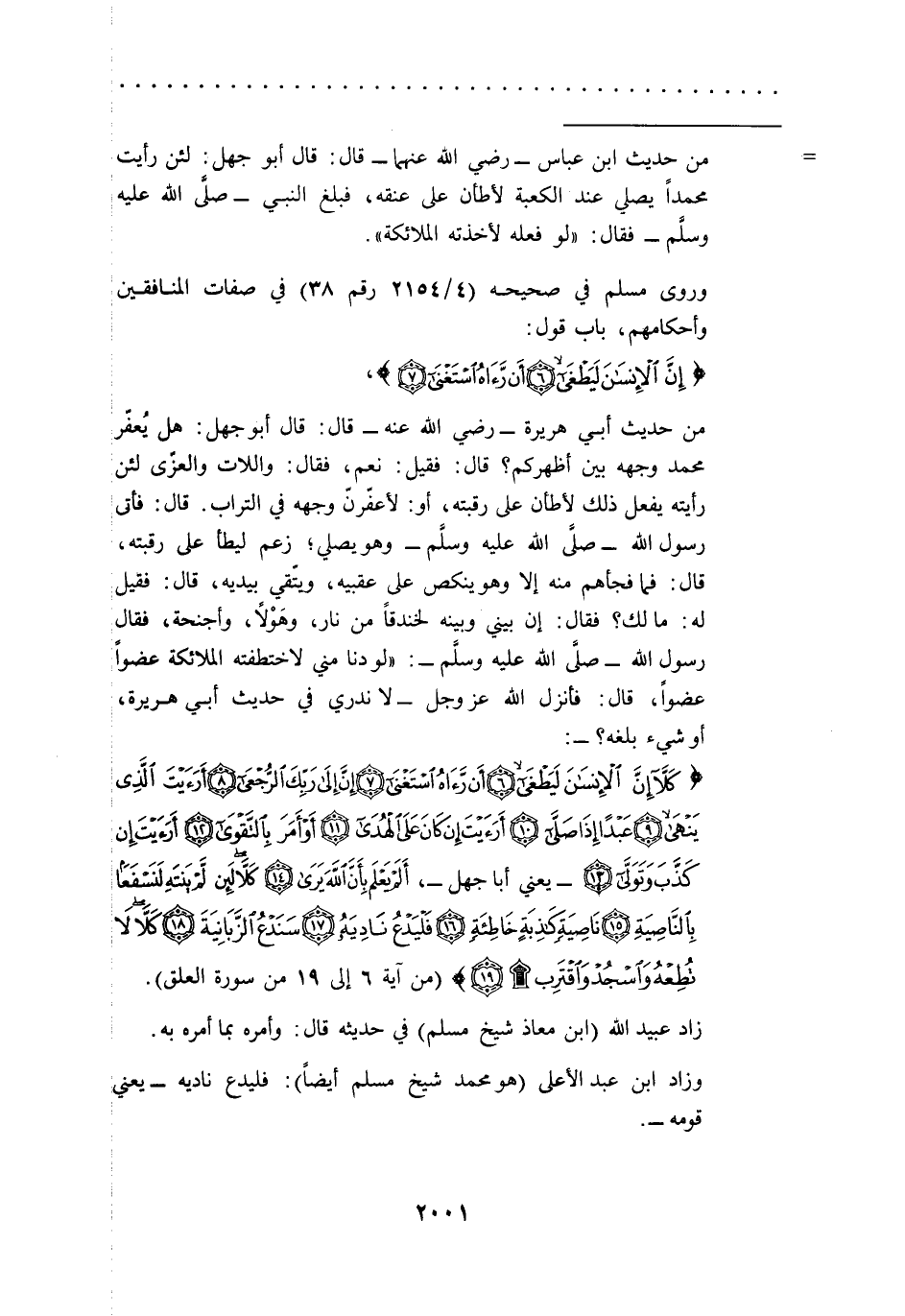 {كَلَّا إِنَّ الْإِنْسَانَ لَيَطْغَى (6) أَنْ رَآهُ اسْتَغْنَى (7) إِنَّ إِلَى رَبِّكَ الرُّجْعَى (8) أَرَأَيْتَ الَّذِي يَنْهَى (9) عَبْدًا إِذَا صَلَّى (10) أَرَأَيْتَ إِنْ كَانَ عَلَى الْهُدَى (11) أَوْ أَمَرَ بِالتَّقْوَى (12) أَرَأَيْتَ إِنْ كَذَّبَ وَتَوَلَّى (13)} [العلق: 6 - 13]-يعني أبا جهل-، {أَلَمْ يَعْلَمْ بِأَنَّ اللَّهَ يَرَى (14) كَلَّا لَئِنْ لَمْ يَنْتَهِ لَنَسْفَعًا بِالنَّاصِيَةِ (15) نَاصِيَةٍ كَاذِبَةٍ خَاطِئَةٍ (16) فَلْيَدْعُ نَادِيَهُ (17) سَنَدْعُ الزَّبَانِيَةَ (18) كَلَّا لَا تُطِعْهُ وَاسْجُدْ وَاقْتَرِبْ (19)} [العلق: 14 - 19] (من آية 6 إلى 19 من سورة العلق).