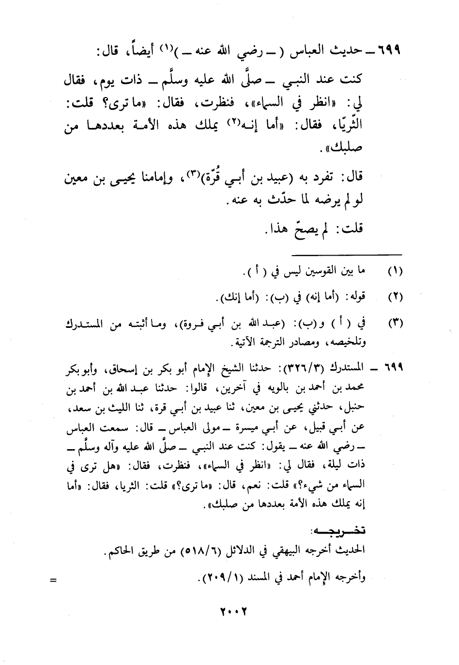 699 - المستدرك (3/ 326): حدثنا الشيخ الِإمام أبو بكر بن إسحاق، وأبو بكر محمد بن أحمد بن بالويه في آخرين، قالوا: حدثنا عبد الله بن أحمد بن حنبل، حدثني يحيى بن معين، ثنا عبيد بن أبي قرة، ثنا الليث بن سعد، عن أبي قبيل، عن أبي ميسرة -مولى العباس- قال: سمعت العباس -رضي الله عنه- يقول: كنت عند النبي -صلى الله عليه وآله وسلم- ذات ليلة، فقال لي: "انظر في السماء"، فنظرت، فقال: "هل ترى في السماء من شيء؟ " قلت: نعم، قال: "ما ترى؟ " قلت: الثريا، فقال: "أما إنه يملك هذه الأمة بعددها من صلبك".