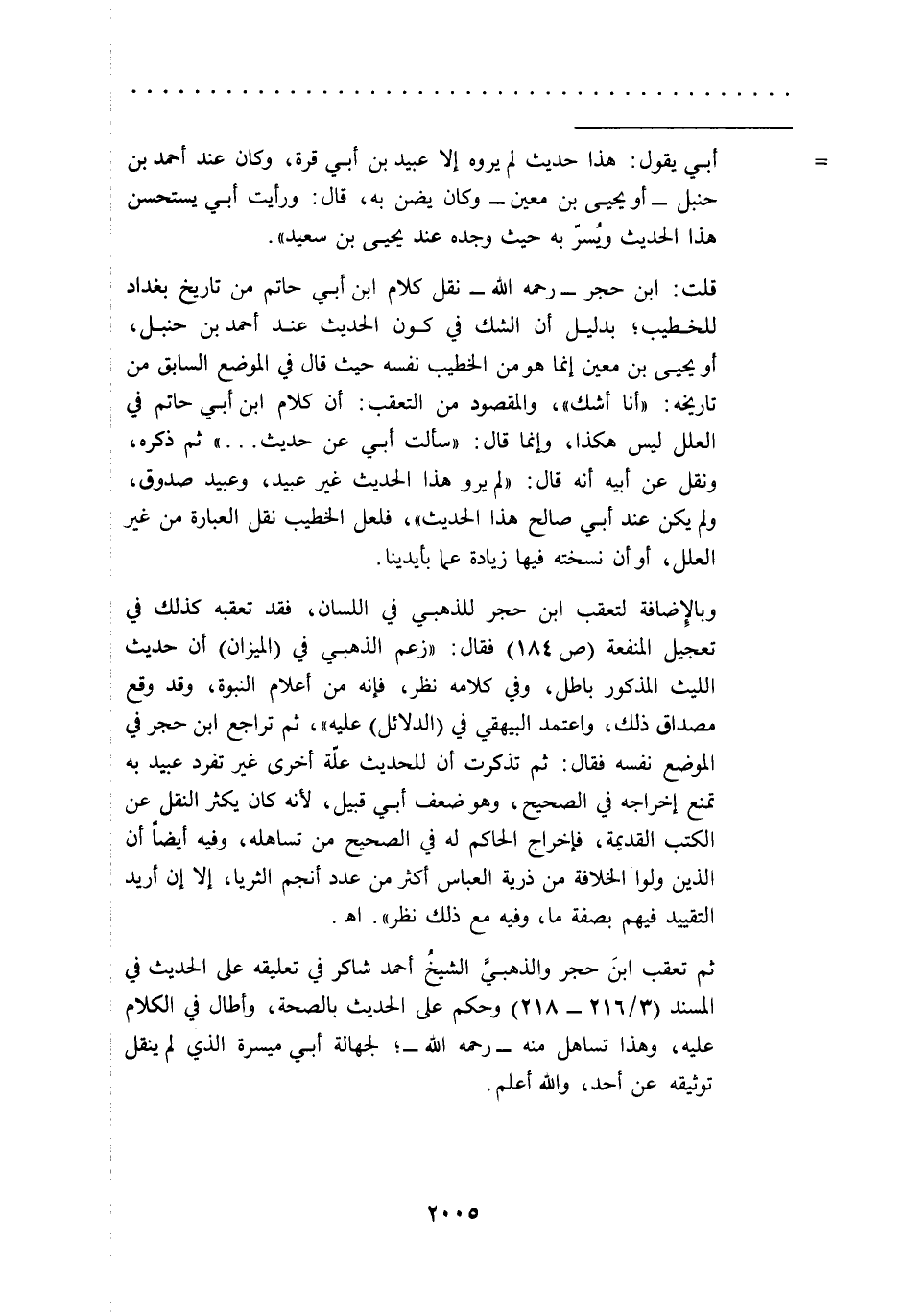 قلت: ابن حجر -رحمه الله- نقل كلام ابن أبي حاتم من تاريخ بغداد للخطيب؛ بدليل أن الشك في كون الحديث عند أحمد بن حنبل، أو يحيى بن معين إنما هو من الخطيب نفسه حيث قال في الموضع السابق من تاريخه: "أنا أشك"، والمقصود من التعقب: أن كلام ابن أبي حاتم في العلل ليس هكذا، وإنما قال: "سألت أبي عن حديث ... " ثم ذكره، ونقل عن أبيه أنه قال: "لم يرو هذا الحديث غير عبيد، وعبيد صدوق، ولم يكن عند أبي صالح هذا الحديث"، فلعل الخطيب نقل العبارة من غير العلل، أو أن نسخته فيها زيادة عما بأيدينا.