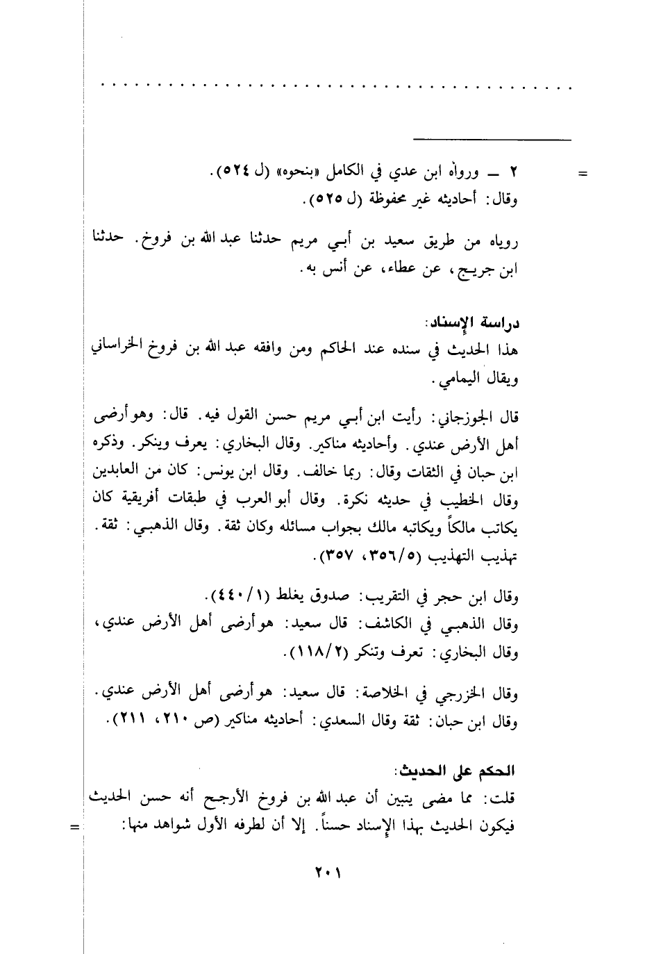 قلت: مما مضى يتبين أن عبد الله بن فروخ الأرجح أنه حسن الحديث فيكون الحديث بهذا الِإسناد حسناً. إلا أن لطرفه الأول شواهد منها: =