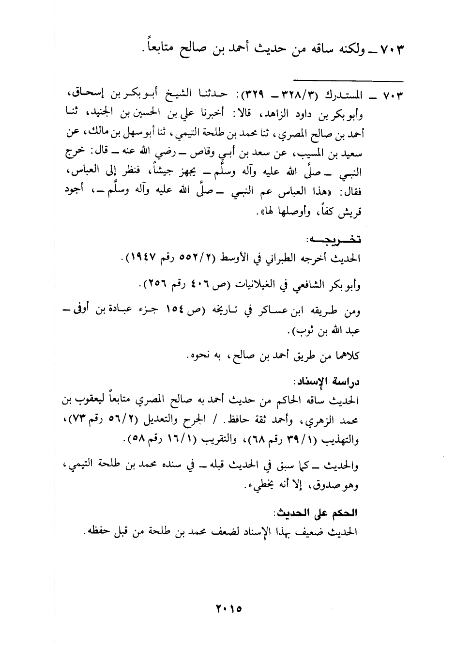 703 - المستدرك (3/ 328 - 329): حدثنا الشيخ أبو بكر بن إسحاق، وأبو بكر بن داود الزاهد، قالا: أخبرنا علي بن الحسين بن الجنيد، ثنا أحمد بن صالح المصري، ثنا محمد بن طلحة التيمي، ثنا أبو سهل بن مالك، عن سعيد بن المسيب، عن سعد بن أبي وقاص -رضي الله عنه- قال: خرج النبي -صلى الله عليه وآله وسلم- يجهز جيشاً، فنظر إلى العباس، فقال: "هذا العباس عم النبي -صلى الله عليه وآله وسلم-، أجود قريش كفاً، وأوصلها لها".