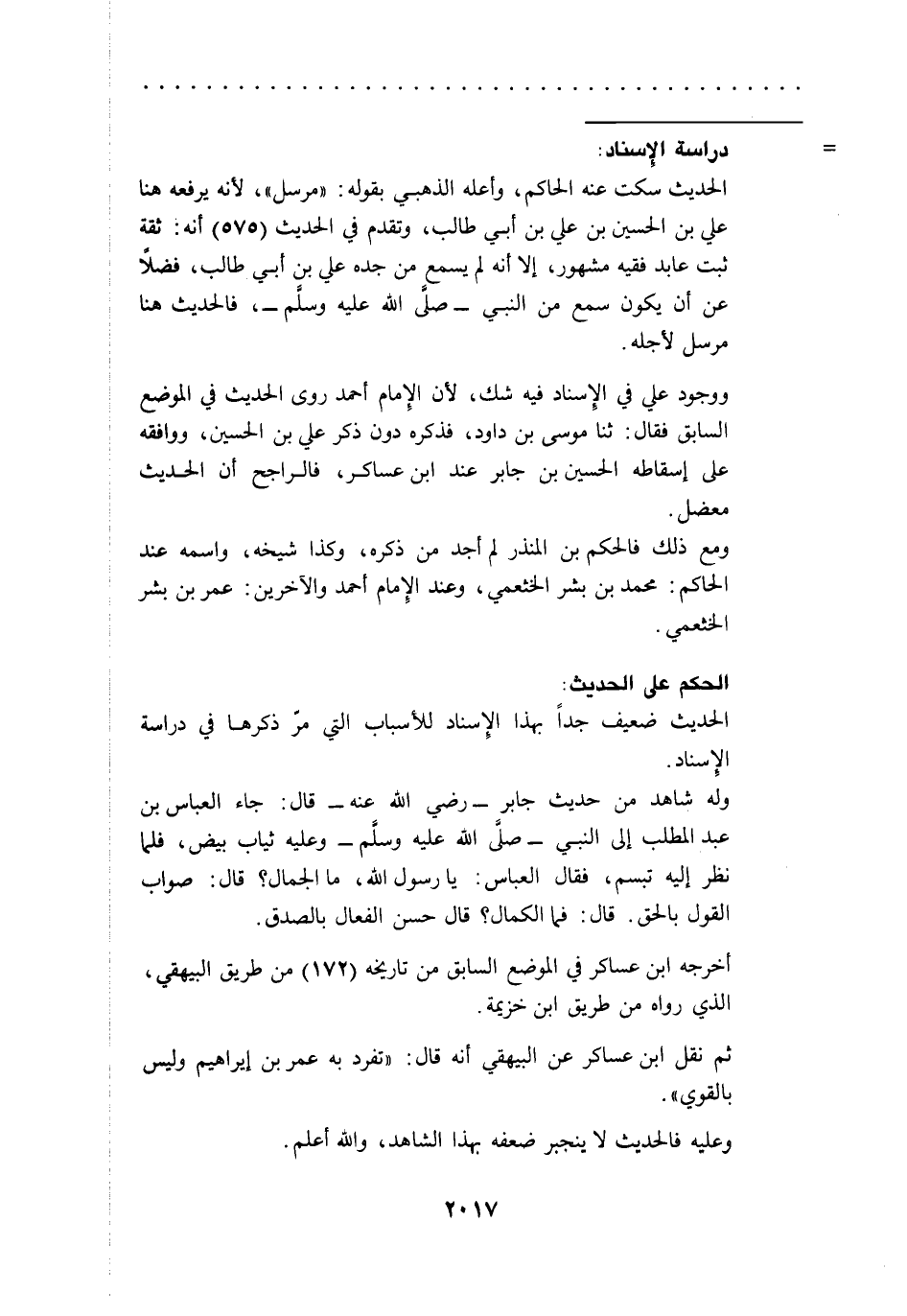 ووجود علي في الِإسناد فيه شك، لأن الِإمام أحمد روى الحديث في الموضع السابق فقال: ثنا موسى بن داود، فذكره دون ذكر علي بن الحسين، ووافقه على إسقاطه الحسين بن جابر عند ابن عساكر، فالراجح أن الحديث معضل.