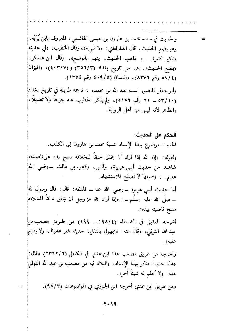 ولقوله: "إن الله إذا أراد أن يخلق خلقاً للخلافة مسح يده على ناصيته" شاهد من حديث أبي هريرة، وأنس، وكعب بن مالك -رضي الله عنهم-، وجميعها لا تصلح للاستشهاد.