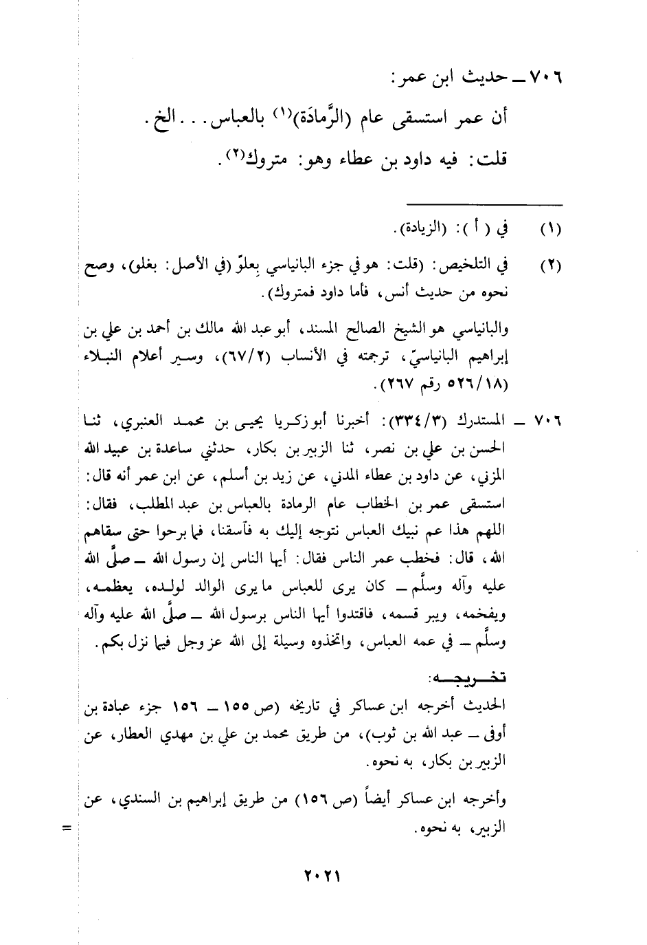 706 - المستدرك (3/ 334): أخبرنا أبو زكريا يحيى بن محمد العنبري، ثنا الحسن بن علي بن نصر، ثنا الزبير بن بكار، حدثني ساعدة بن عبيد الله المزني، عن داود بن عطاء المدني، عن زيد بن أسلم، عن ابن عمر أنه قال: استسقى عمر بن الخطاب عام الرمادة بالعباس بن عبد المطلب، فقال: اللهم هذا عم نبيك العباس نتوجه إليك به فآسقنا، فما برحوا حتى سقاهم الله، قال: فخطب عمر الناس فقال: أيها الناس إن رسول الله -صلى الله عليه وآله وسلم- كان يرى للعباس ما يرى الوالد لولده، يعظمه، ويفخمه، ويبر قسمه، فاقتدوا أيها الناس برسول الله -صلى الله عليه وآله وسلم- في عمه العباس، واتخذوه وسيلة إلى الله عز وجل فيما نزل بكم.