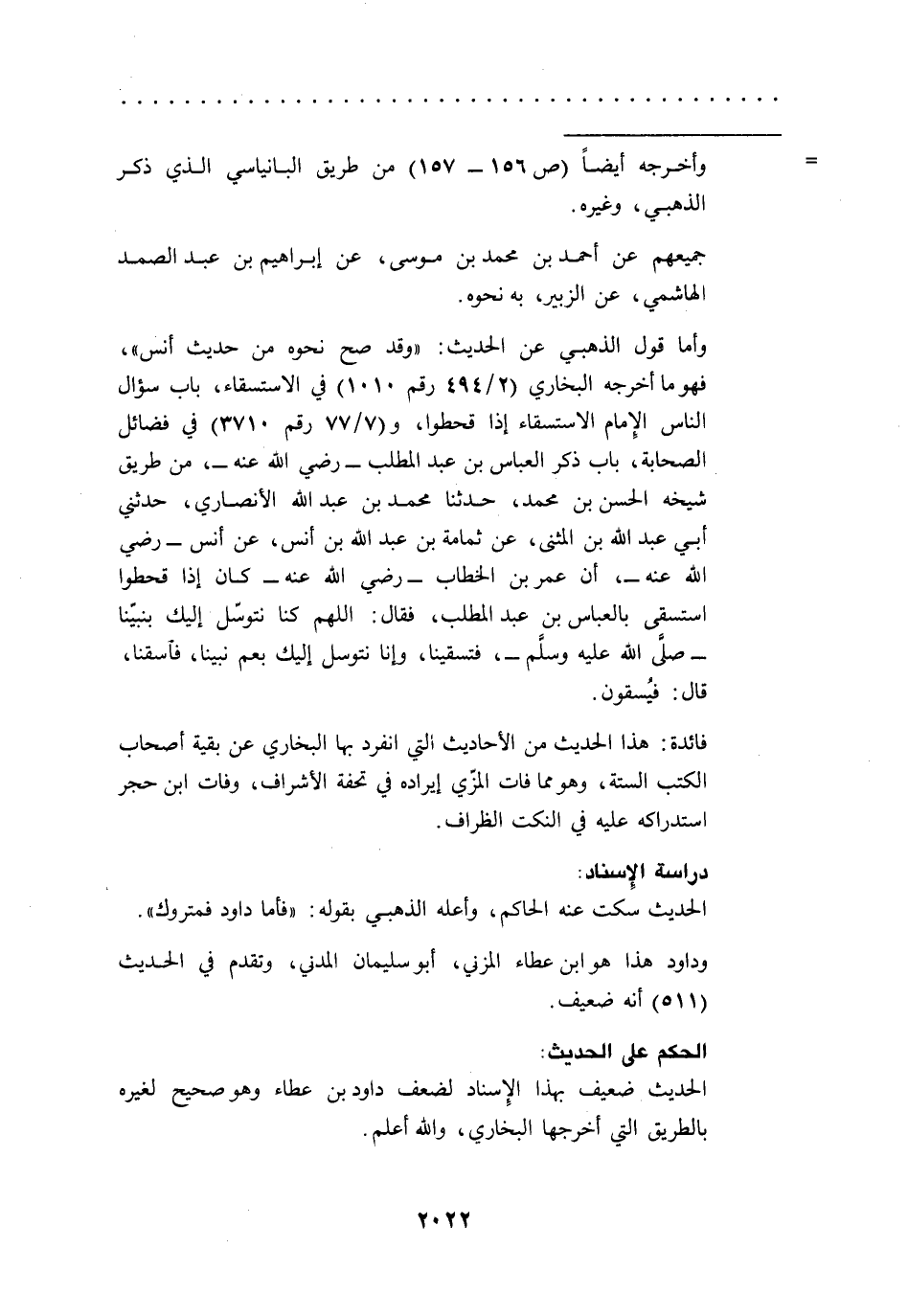 وأما قول الذهبي عن الحديث: "وقد صح نحوه من حديث أنس"، فهو ما أخرجه البخاري (2/ 494رقم 1010) في الاستسقاء، باب سؤال الناس الِإمام الاستسقاء إذا قحطوا، و (7/ 77رقم3710) في فضائل الصحابة، باب ذكر العباس بن عبد الطلب -رضي الله عنه-، من طريق شيخه الحسن بن محمد، حدثنا محمد بن عبد الله الأنصاري، حدثني أبي عبد الله بن المثنى، عن ثمامة بن عبد الله بن أنس، عن أنس -رضي الله عنه أن عمر بن الخطاب -رضي الله عنه- كان إِذا قحطوا استسقى بالعباس بن عبد الطلب، فقال: اللهم كنا نتوسّل إليك بنبيّنا -صلى الله عليه وسلم-، فتسقينا، وإنا نتوسل إليك بعم نبينا، فآسقنا، قال: فيُسقون.