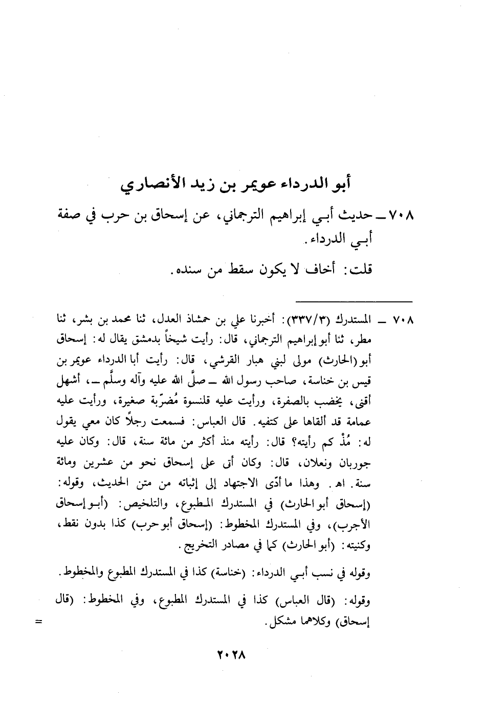 708 - المستدرك (3/ 337): أخبرنا علي بن حمشاذ العدل، ثنا محمد بن بشر، ثنا مطر، ثنا أبو إبراهيم الترجماني، قال: رأيت شيخاً بدمشق يقال له: إسحاق أبو (الحارث) مولى لبني هبار القرشي، قال: رأيت أبا الدرداء عويمر بن قيس بن خناسة، صاحب رسول الله -صلى الله عليه وآله وسلم-، أشهل أقنى، يخضب بالصفرة، ورأيت عليه قلنسوة مُضرّبة صغيرة، ورأيت عليه عمامة قد ألقاها على كتفيه. قال العباس: فسمعت رجلاً كان معين يقول له: مُذْ كم رأيته؟ قال: رأيته منذ أكثر من مائة سنة، قال: وكان عليه جوربان ونعلان، قال: وكان أتى على إسحاق نحو من عشرين ومائة سنة. اهـ. وهذا ما أدّى الاجتهاد إلى إثباته من متن الحديث، وقوله: (إسحاق أبو الحارث) في المستدرك المطبوع، والتلخيص: (أبو إسحاق الأجرب)، وفي المستدرك المخطوط: (إسحاق أبو حرب) كذا بدون نقط، وكنيته: (أبو الحارث) كما في مصادر التخريج.