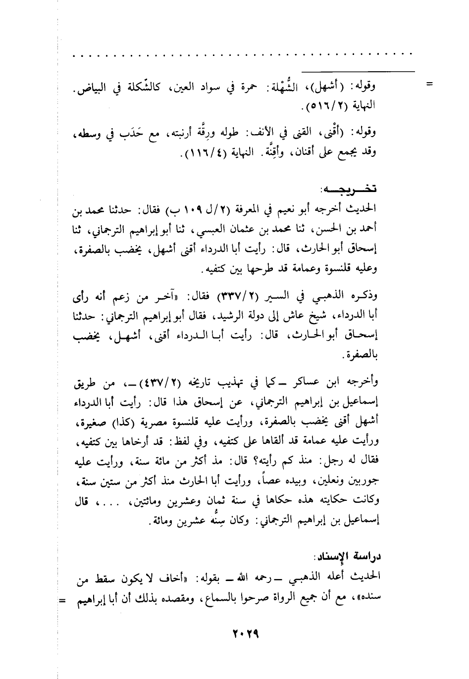 الحديث أخرجه أبو نعيم في المعرفة (2/ ل 109 ب) فقال: حدثنا محمد بن أحمد بن الحسن، ثنا محمد بن عثمان العبسي، ثنا أبو إبراهيم الترجماني، ثنا إسحاق أبو الحارث، قال: رأيت أبا الدرداء أقنى أشهل، يخضب بالصفرة، وعليه قلنسوة وعمامة قد طرحها بين كتفيه.
