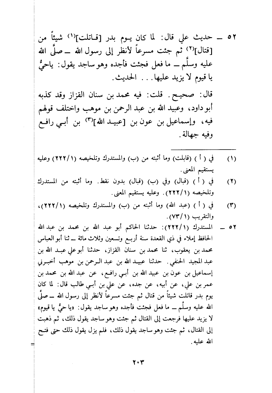52 - المستدرك (1/ 222): حدثنا الحاكم أبو عبد الله بن محمد بن عبد الله الحافظ إملاء في ذي القعدة سنة أربع وتسعين وثلاث مائة- ثنا أبو العباس محمد بن يعقوب، ثنا محمد بن سنان القزاز، حدثنا أبو علي عبد الله بن عبد المجيد الحنفي. حدثنا عبيد الله بن عبد الرحمن بن موهب أخبرني إسماعيل بن عون بن عبيد الله بن أبي رافع، عن عبد الله بن محمد بن عمر بن علي، عن أبيه، عن جده، عن علي بن أبي طالب قال: لما كان يوم بدر قاتلت شيئاً من قتال ثم جئت مسرعاً لأنظر إلى رسول الله -صلى الله عليه وسلم- ما فعل فجئت فأجده وهو ساجد يقول: "يا حيُّ يا قيوم" لا يزيد عليها فرجعت إلى القتال ثم جئت وهو ساجد يقول ذلك، ثم ذهبت إلى القتال، ثم جئت وهو ساجد يقول ذلك، فلم يزل يقول ذلك حتى فتح الله عليه. =