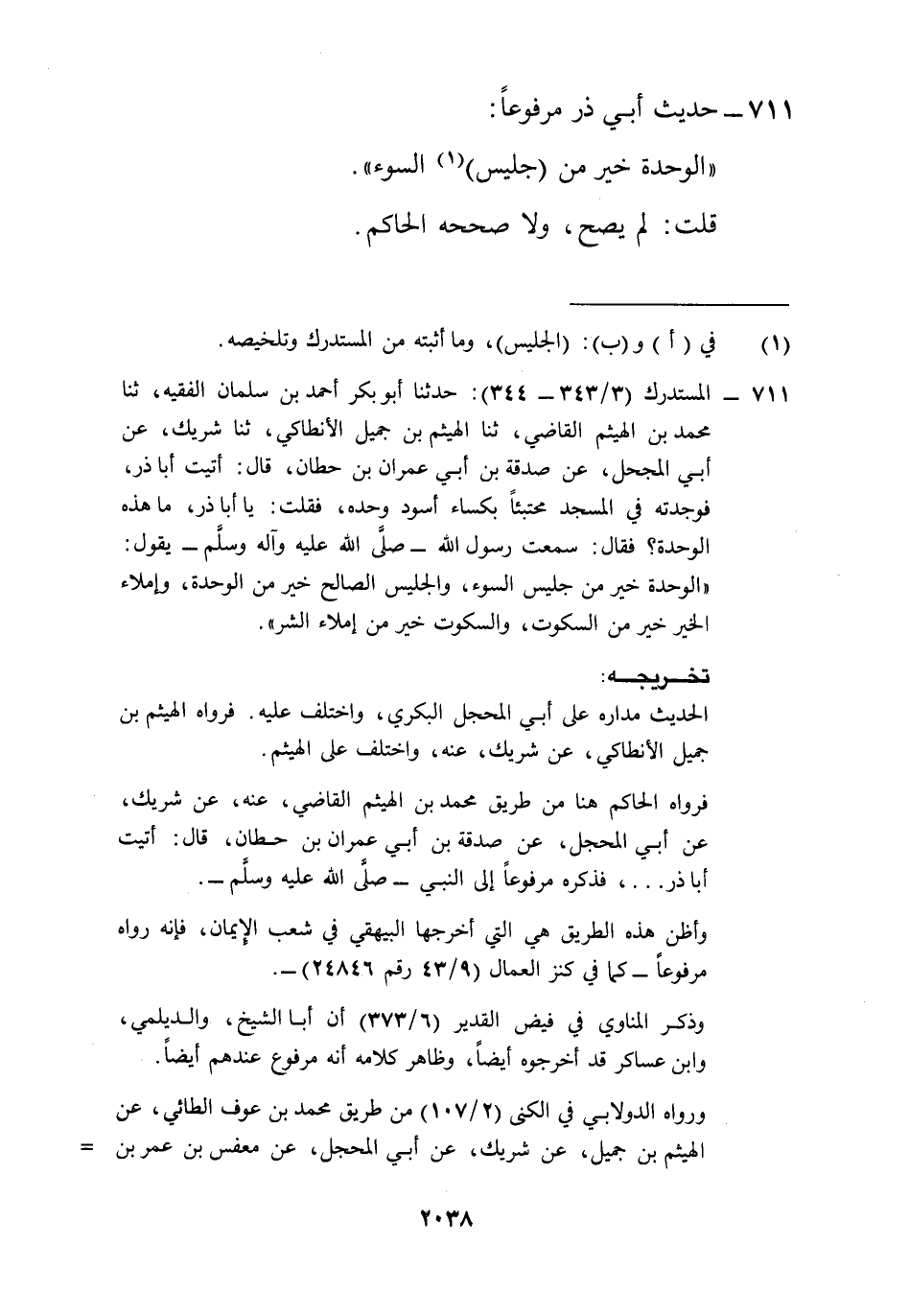711 - المستدرك (3/ 343 - 344): حدثنا أبو بكر أحمد بن سلمان الفقيه، ثنا محمد بن الهيثم القاضي، ثنا الهيثم بن جميل الأنطاكي، ثنا شريك، عن أبي المجحل، عن صدقة بن أبي عمران بن حطان، قال: أتيت أبا ذر، فوجدته في المسجد محتبئاً بكساء أسود وحده، فقلت: يا أبا ذر، ما هذه الوحدة؟ فقال: سمعت رسول الله -صلى الله عليه وآله وسلم- يقول: "الوحدة خير من جليس السوء، والجليس الصالح خير من الوحدة، وإملاء الخير خير من السكوت، والسكوت خير من إملاء الشر".