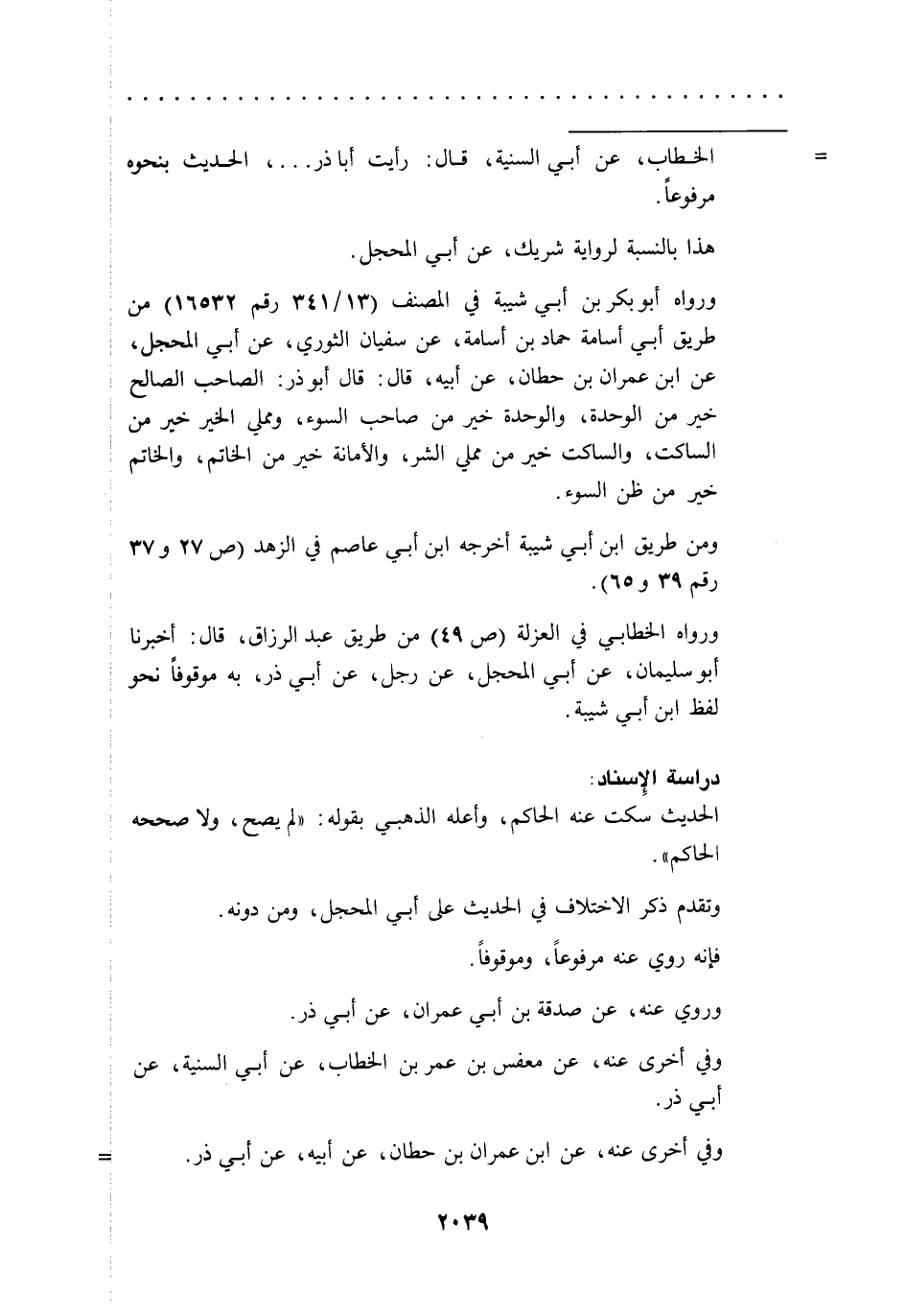 ورواه الخطابي في العزلة (ص 49) من طريق عبد الرزاق، قال: أخبرنا أبو سليمان، عن أبي المحجل، عن رجل، عن أبي ذر، به موقوفاً نحو لفظ ابن أبي شيبة.